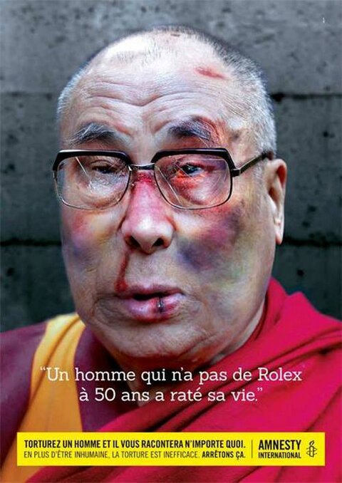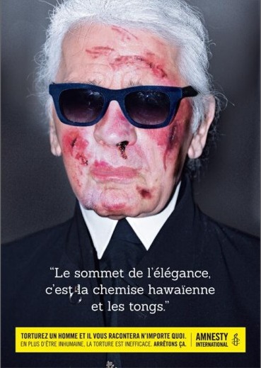 Sono loro i tre testimonial della nuova campagna realizzata da Amnesty International Belgio contro la tortura. Iggy, il Dalai Lama e Lagerfeld appaiono tutti e tre con il volto tumefatto come segno delle torture subite. Il sangue fuoriesce copioso dalle cicatrici.