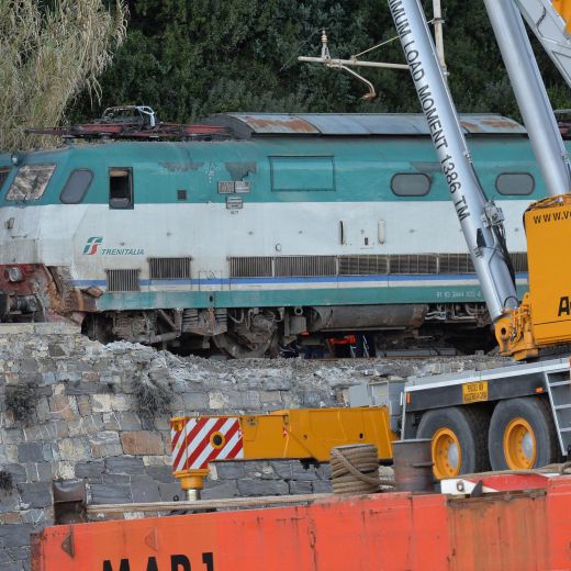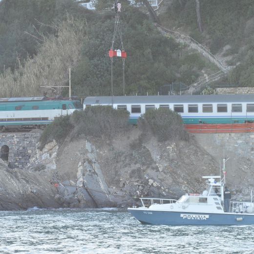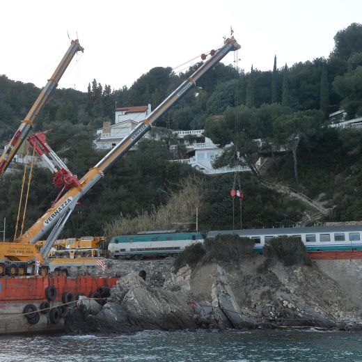 La chiatta con le cinque gru si è avvicinata lunedì mattina alla costa di Capo Mimosa (Savona) e ha ancorato la motrice e il vagone del treno deragliato. La motrice dell’Intercity è stata inizialmente imbracata, poi dal braccio di una delle gru, alto oltre 60 metri, sono stati calati i cavi d’acciaio che grazie al controbilanciamento di una piccola gru posizionata a terra hanno permesso di ricollocare la motrice sui binari. Solo in serata il treno ha è stato trainato via. (Foto Ansa).