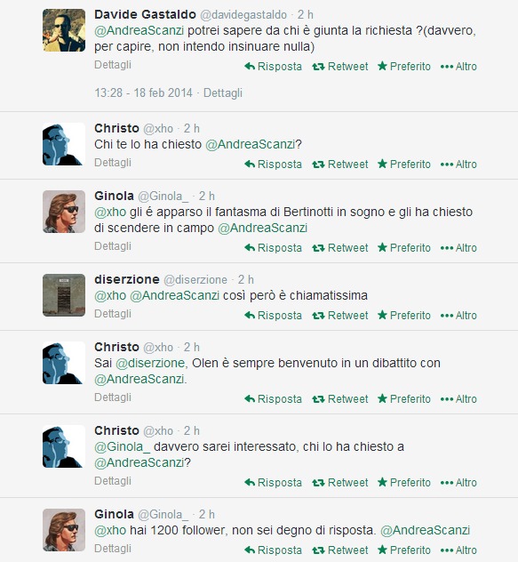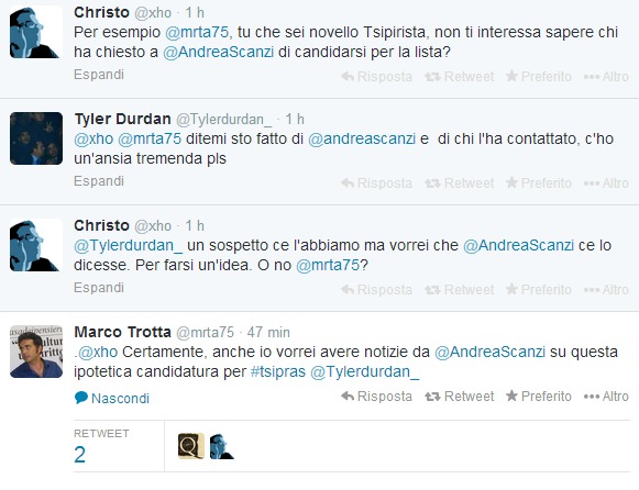 ROMA – Poche ore fa Andrea Scanzi, giornalista del Fatto Quotidiano, ha scritto su Twitter che: “Mi è stato appena chiesto di candidarmi nella Lista Tsipras. Ho ringraziato, ma risolutamente declinato. Faccio un altro lavoro”.