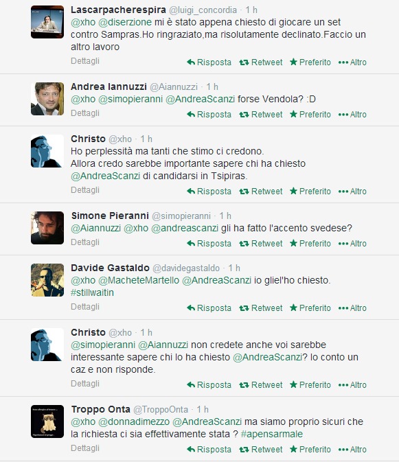 Immediate le reazioni. Soprattutto c’è chi si chiede a chi sia venuta in mente una mossa del genere. L’unica certezza è che nessuno sembra esprimere approvazione per l’idea della candidatura ma se invece la questione ha un fondo di verità qualcuno della Lista Tsipras ora ha un problema, perché la richiesta a Scanzi, all’occhio di molti potenziali elettori della stessa lista, apparirà indigesto.