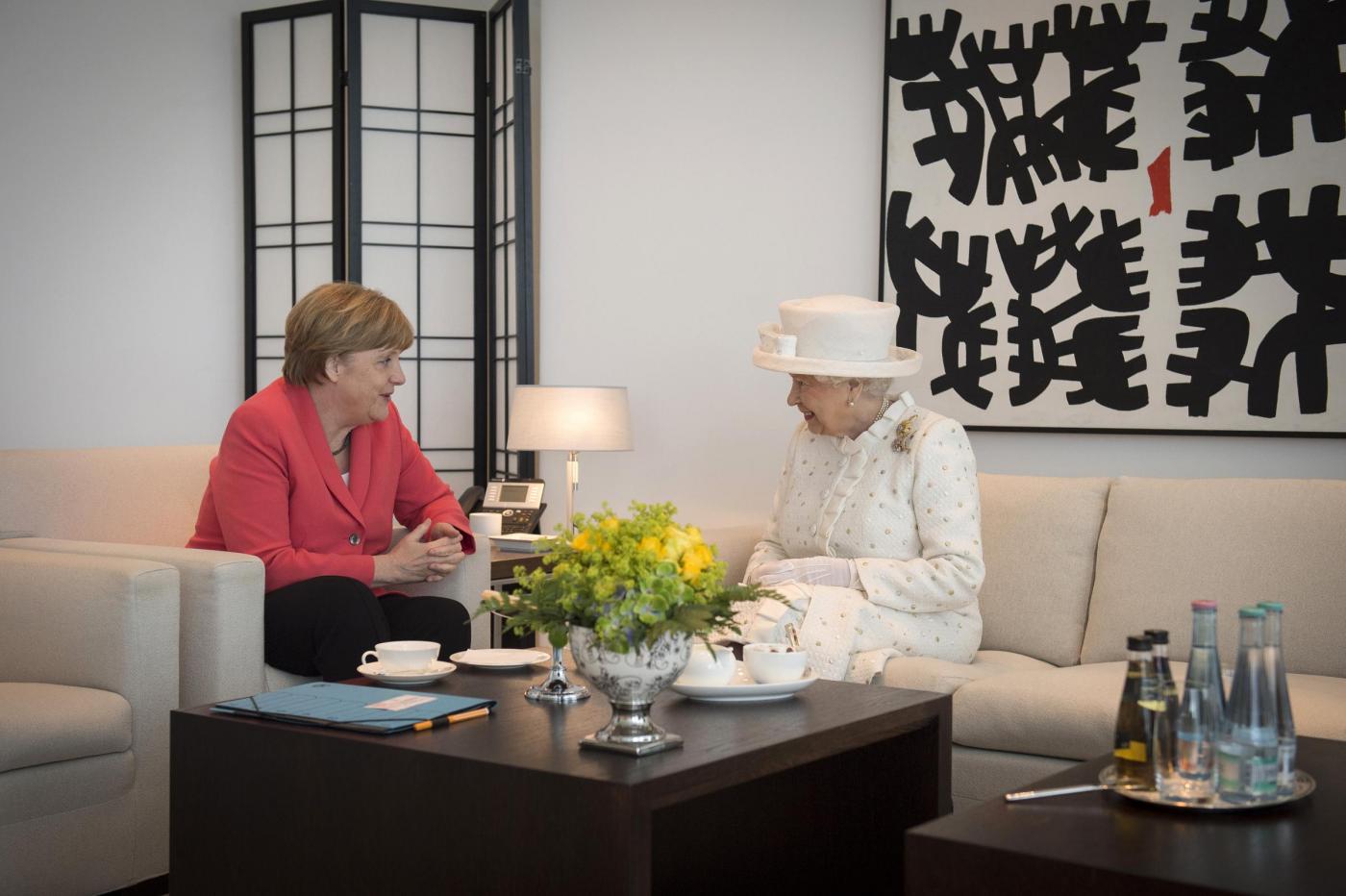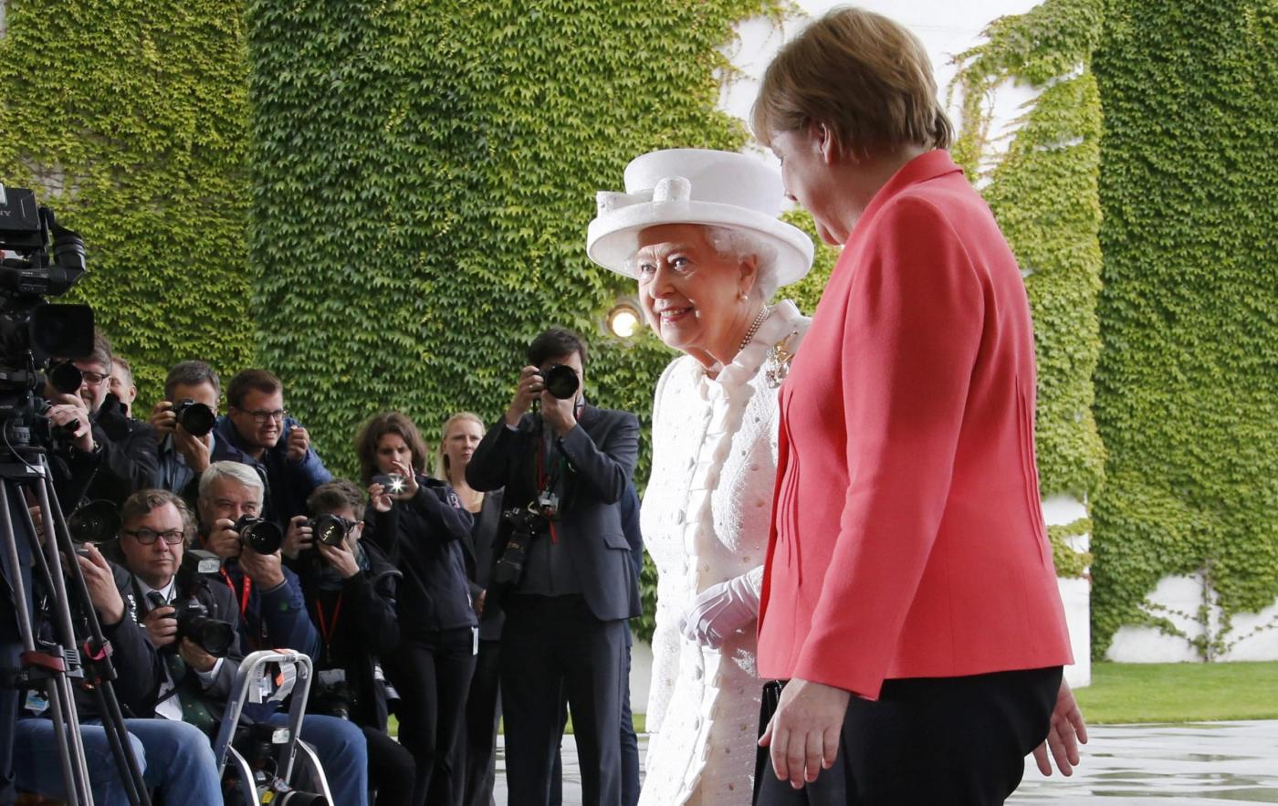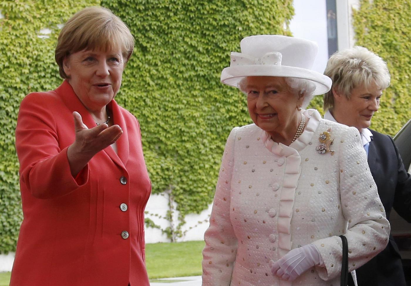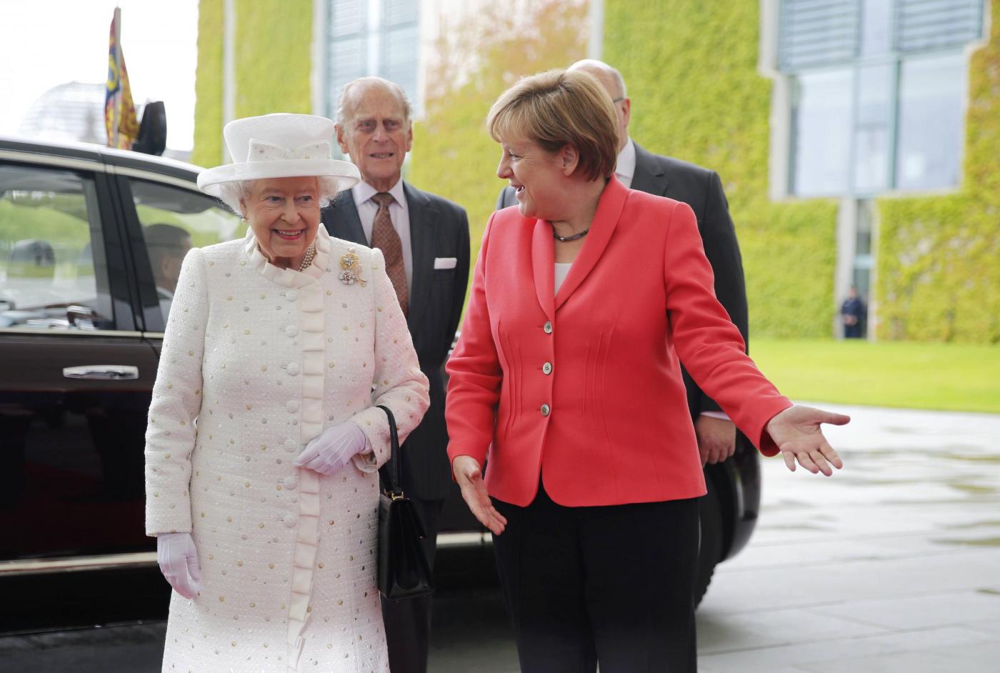 BERLINO – Angela Merkel versione austerity anche nell’abbigliamento: accoglie la regina Elisabetta con la stessa giacca indossata al G7. La regina britannica e il principe consorte Filippo di Edimburgo sono arrivati martedì sera in Germania per una visita ufficiale di quattro giorni, che li porterà, oltreché a Berlino, a Francoforte e al memoriale del campo di concentramento di Bergen-Belsen.