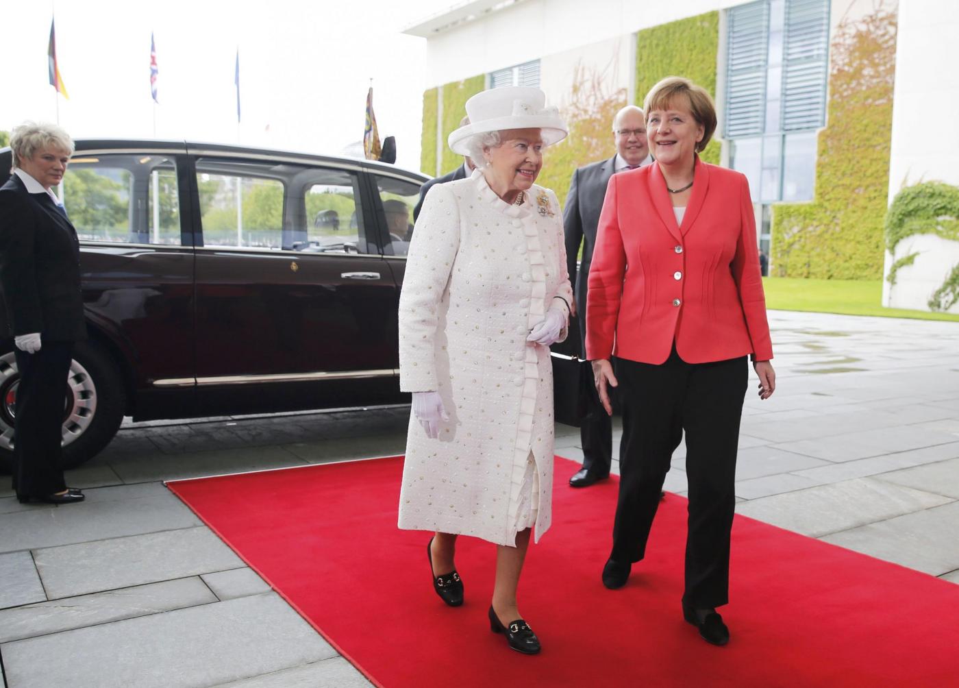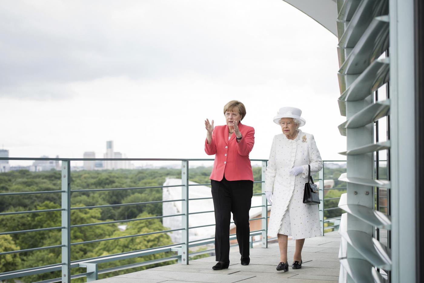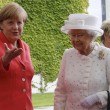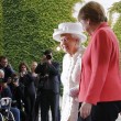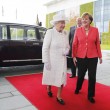 BERLINO – Angela Merkel versione austerity anche nell’abbigliamento: accoglie la regina Elisabetta con la stessa giacca indossata al G7. La regina britannica e il principe consorte Filippo di Edimburgo sono arrivati martedì sera in Germania per una visita ufficiale di quattro giorni, che li porterà, oltreché a Berlino, a Francoforte e al memoriale del campo di concentramento di Bergen-Belsen.