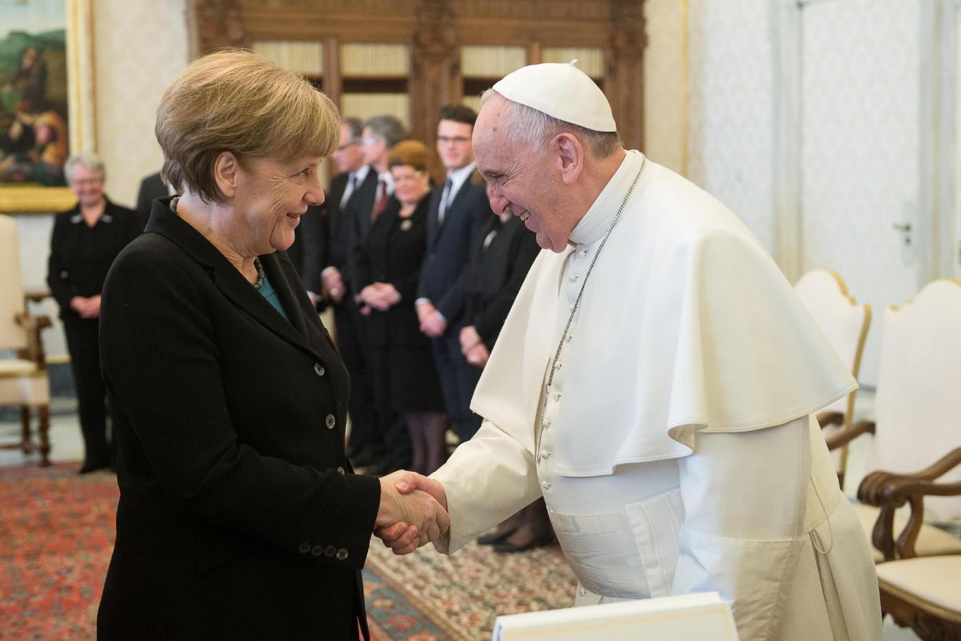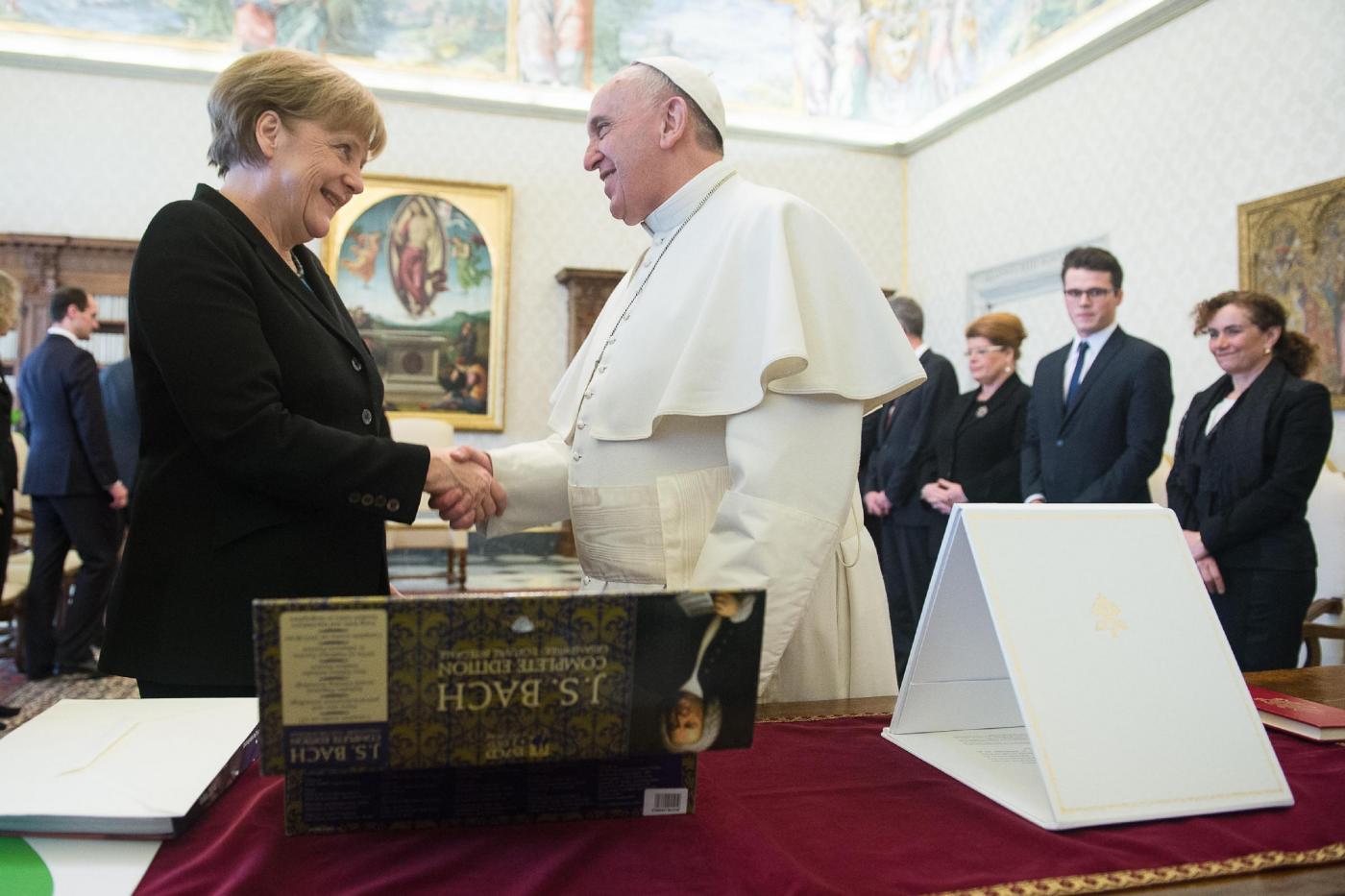 “Mi piace regalare questa immagine ai capi di Stato perché penso che il loro lavoro sia proteggere i loro poveri”, ha detto Papa Francesco. E Merkel ha risposto: “Noi cerchiamo di fare il nostro meglio”.