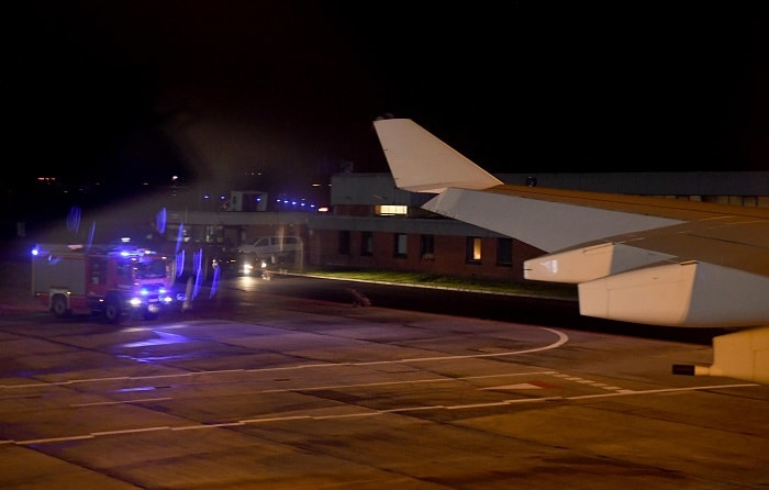 L'aereo della Merkel circondato dai mezzi di emergenza (Ansa)