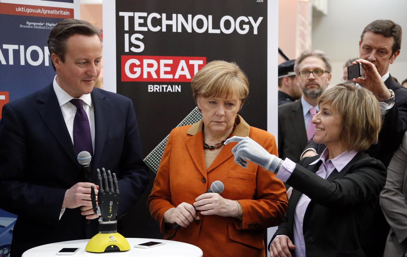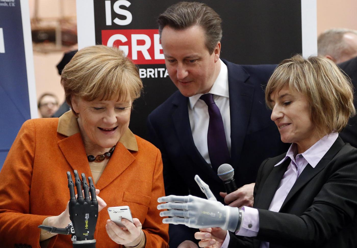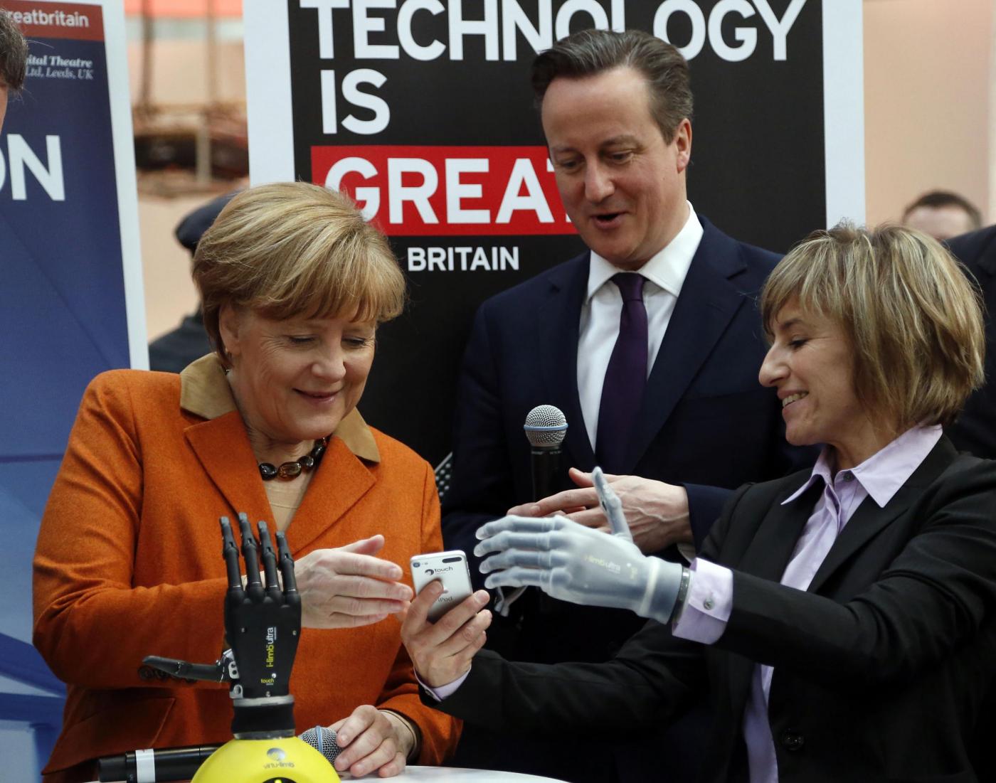 Insieme alla Merkel c’è anche David Cameron, il primo ministro inglese e lei, durante la visita è protagonista di un piccolo episodio divertente che non sfugge ai fotografi. Ad un certo punto, la cancelliera si mette a stringere una mano bionica comandata attraverso uno smartphone e l’apposita app, davanti allo sguardo divertito di Cameron (foto Ap/LaPresse)