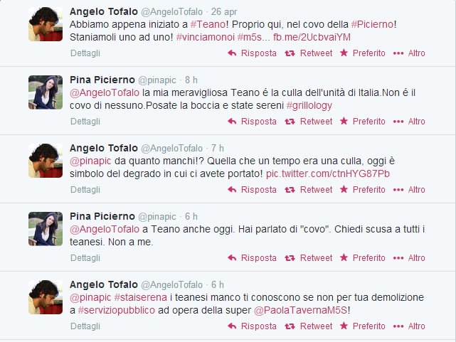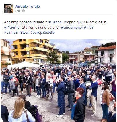 Questa volta Tofalo ha iniziato un botta e risposta con la candidata alle europee del Pd Pina Picierno sui social networl. Il deputato M5s pubblica su Twitter e Facebook la foto di un raduno a Teano scrivendo: “Abbiamo appena iniziato a #Teano! Proprio qui, nel covo della #Picierno! Staniamoli uno ad uno!”.