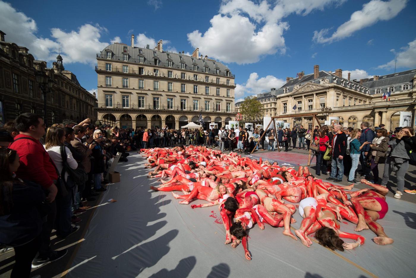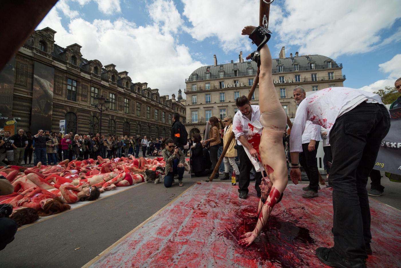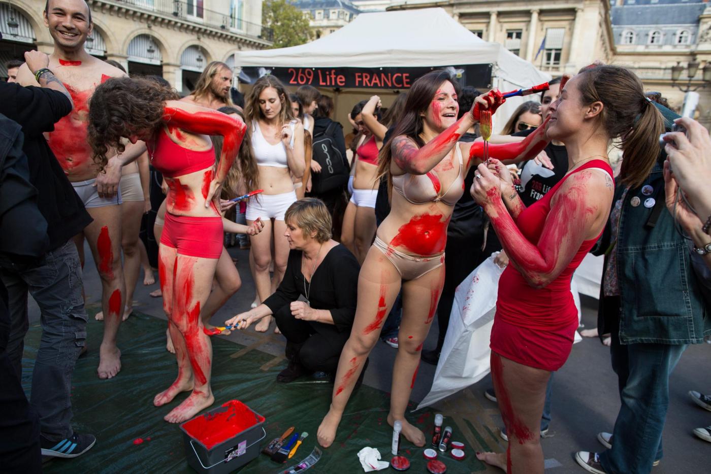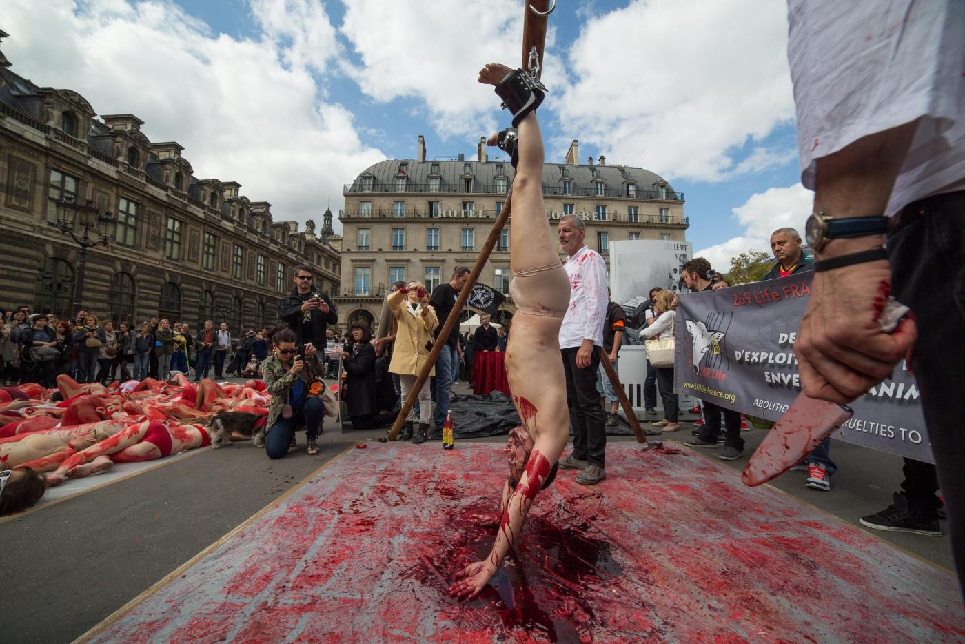 PARIGI – Centinaia di attivisti per i diritti degli animali che fanno parte dell’associazione vegana “269Life”, hanno manifestato nel centro di Parigi dipingendo i loro corpi di color rosso sangue.
