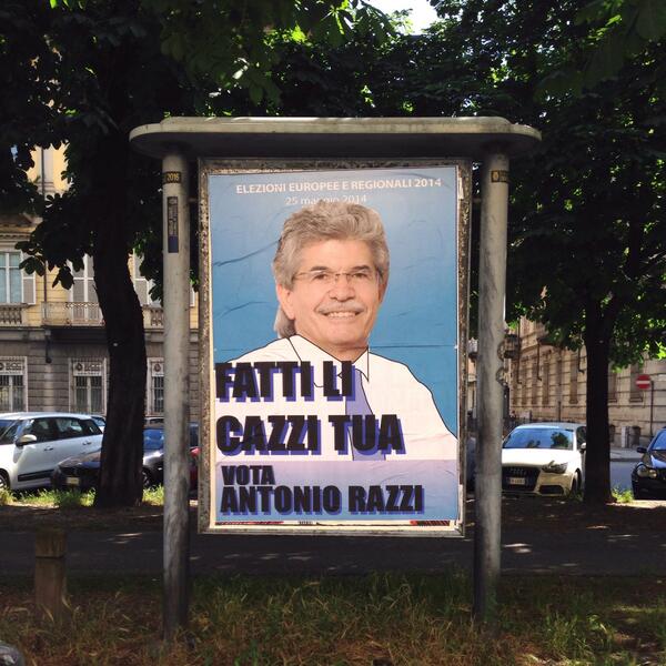 Sulla sua pagina Facebook, infatti, proprio nel giorno in cui gli italiani votano per Europee e amministrative, Razzi pubblica una serie di foto che lo immortalano vicino a un suo sostenitore. E la maglietta che porta il sostenitore ha lo stesso slogan dei manifesti di Torino. Una sola differenza, una sfumatura dialettale. Sul manifesto si legge “fatti li cazzi tua”, sulla maglietta “fatti li cazzi tuoi”. Politicamente cambia poco.