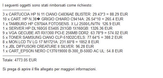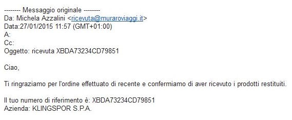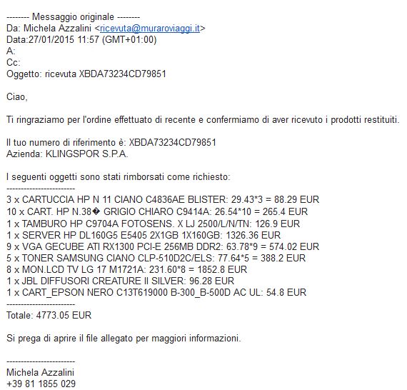 ROMA – Negli ultimi giorni sta circolando una e-mail, mittente Michela Azzalini, che contiene al suo interno un malware (ransomware ). Il messaggio simula il rimborso di un ordine, che ovviamente non esiste, e invita il destinatario ad aprire l’allegato “per maggiori informazioni”. L’allegato però contiene un file Cabinet che, una volta aperto, installa automaticamente un software ransomware che cripta parti dell’hard disk impedendone l’utilizzo. Unico modo per tornare alla normalità è sborsare una cifra di riscatto.