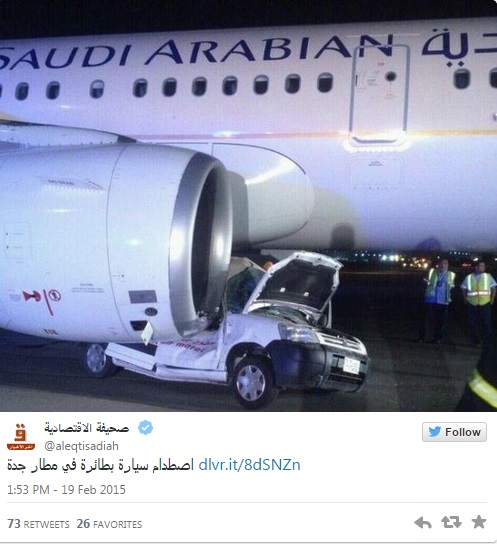 La settimana scorsa, un Airbus A320 della Saudi Arabian Airlines ha schiacciato con il motore destro, un’auto di servizio dell’aeroporto di Jeddah.