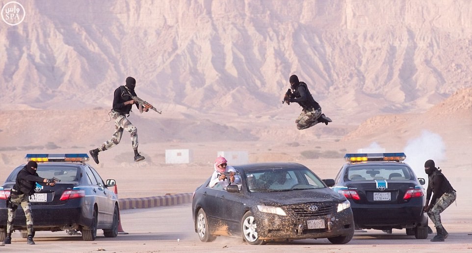 RYAD – Queste immagini sembrano provenire dal set di un film d’azione. In realtà si tratta di un’esercitazione militare compiuta dalle forze di sicurezza dell’Arabia Saudita. A pubblicare le foto scattate nel deserto ad ovest di Ryad è la Reuters: uno degli scatti mostra due uomini armati di passamontagna e pistole. I due saltano sulle auto della polizia in movimento.
