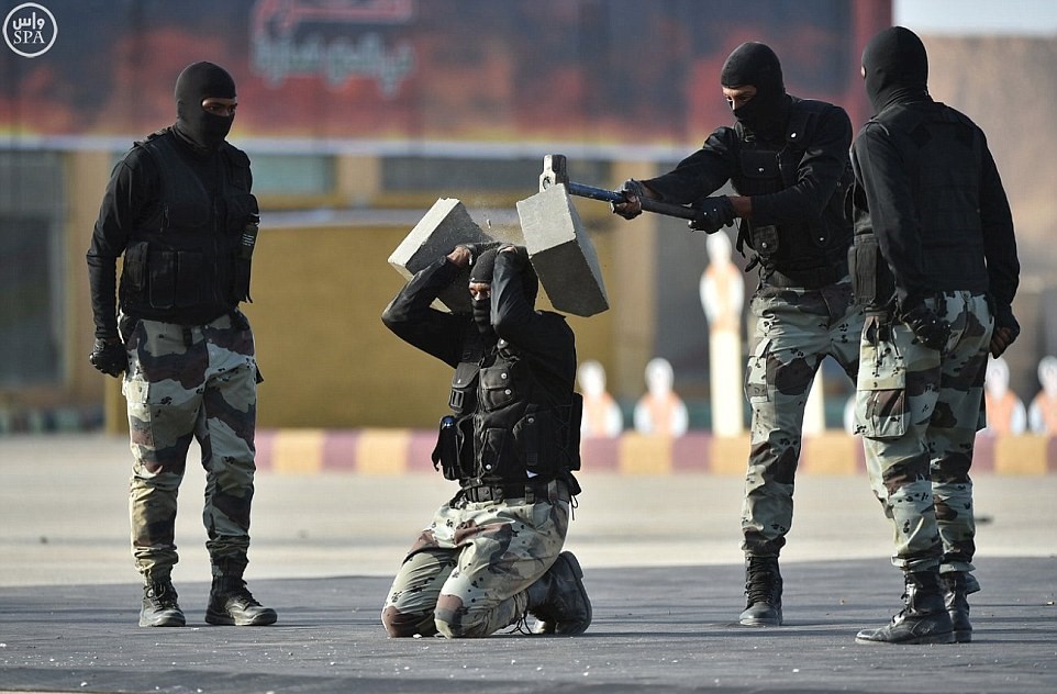 Un’altra istantanea mostra una grande esplosione sullo sfondo con una serie di Jeep militari che passano accanto. In un’altra, degli agenti si calano con una fune da un elicottero, in un’latra ancora, un membro delle forze di sicurezza ha un mattone sulla testa che viene rotto con una picconata.