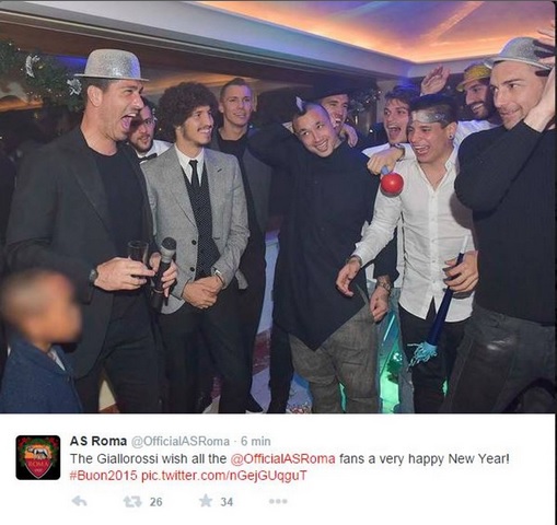 ROMA – Il profilo Twitter dell’ As Roma ha pubblicato alcune foto dei festeggiamenti dei giocatori giallorossi che si sono ritrovati a casa del capitano Francesco Totti: “Il brindisi di Capodanno dei giallorossi: ancora buon 2015 a tutti i tifosi della Roma”. Nelle foto appaiono scatenati Nainggolan, Florenzi, Iturbe, De Sanctis, Totti, Ucan, Balzaretti, Astori. Foto dal profilo Twitter ufficiale dell’As Roma.