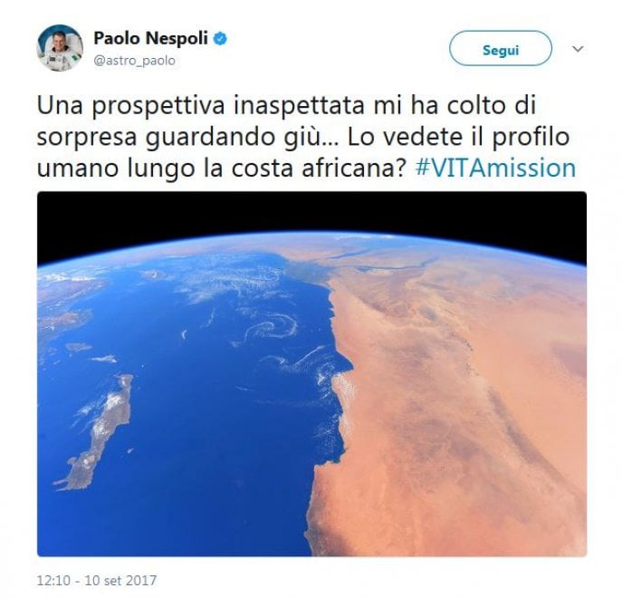 ROMA – Un profilo di uomo lungo la costa nordafricana. E’ la spettacolare fotografia scattata da AstroPaolo Nespoli e postata sul suo profilo Twitter. L’immagine suggestiva è stata immortalata dalla Stazione spaziale internazionale, dove attualmente l’astronauta italiano si trova per la missione Vita (Vitality, innovation, technology, ability).