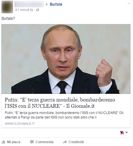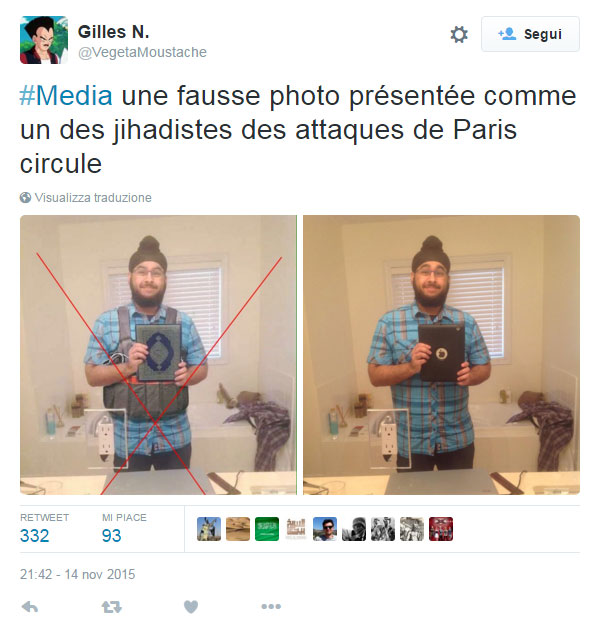 E poi su Facebook si sono moltiplicate le bufale: c’è il falso messaggio della ragazza sopravvissuta all’attentato di Parigi, il falso selfie del presunto terrorista e le false dichiarazioni di Putin. Il sito satirico IlGioMale.it ha infatti diffuso una falsa notizia su Putin, sostenendone una falsa dichiarazione in cui viene sostenuto un prossimo bombardamento all’Isis con il nucleare. E poi ci sono le migliaia di false foto segnaletiche dei presunti terroristi di Parigi.