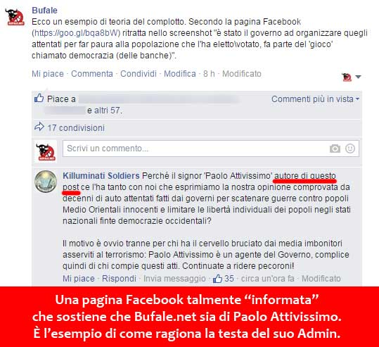 PARIGI – Il sito bufale.net sta raccogliendo in queste ore tutte le teorie del complotto e le bufale più assurde sugli attentati di Parigi di venerdì 13 novembre. Sono solo le 23,59 di venerdì, sono passati pochi minuti dagli attentati di Parigi, quando la pagina Facebook “Killuminati soldiers” pubblica il primo post complottista. Questo il testo del post: “E’ stato il governo ad organizzare quegli attentati per far paura alla popolazione che l’ha eletto\votato, fa parte del gioco chiamato democrazia (delle banche)”.