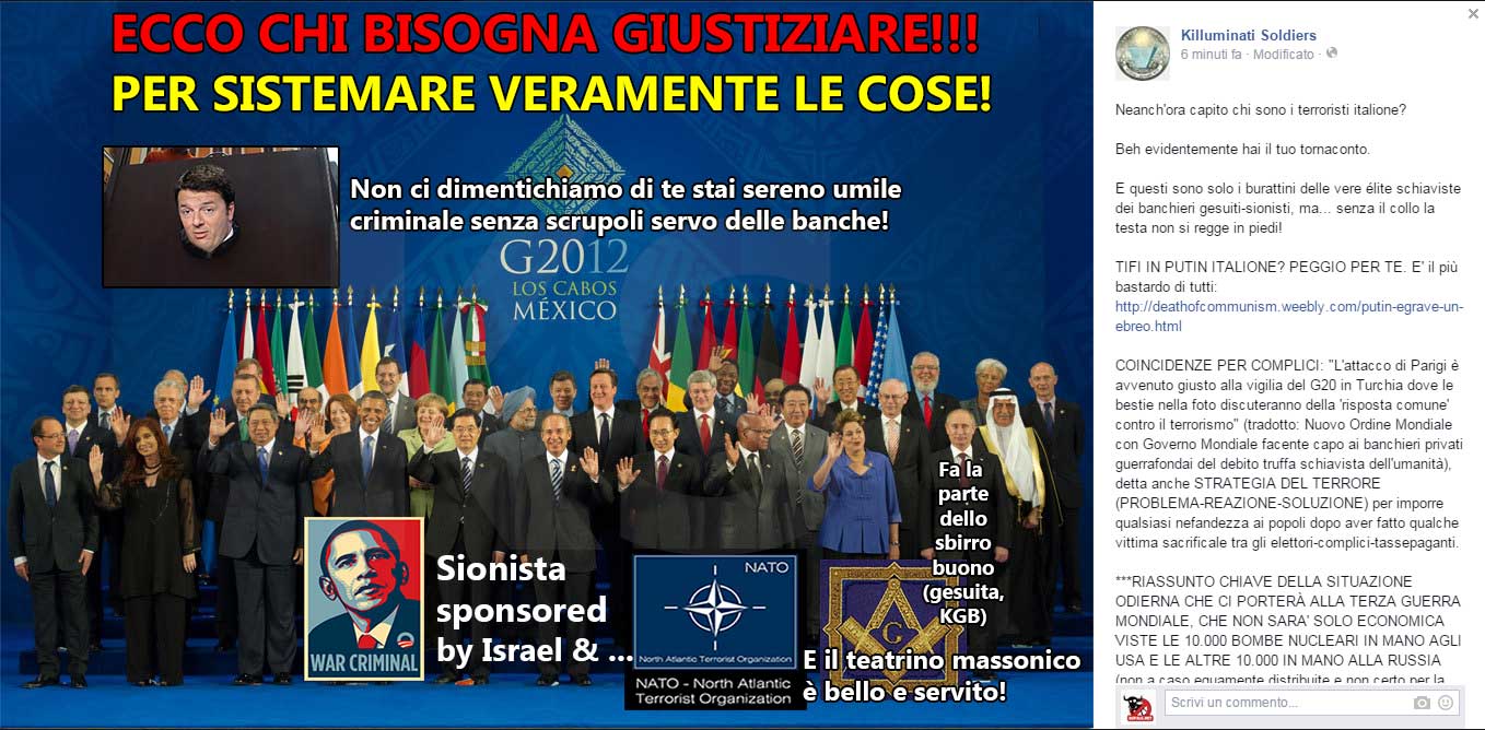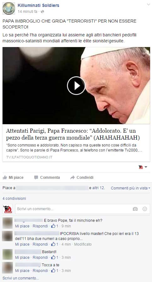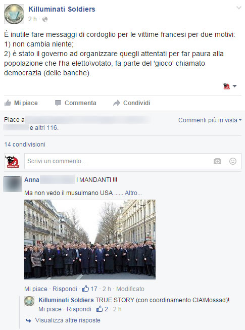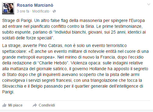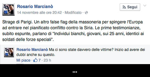La stessa pagina accusa Papa Francesco. Il post è allucinato: “Papa Imbroglio che grida terroristi per non essere scoperto”. Con tanto di commenti. Oltre alla pagina “Killuminati soldiers” anche Rosario Marcianò, definito da bufale.net, il guru delle scie chimiche, grida al complotto: ” Strage di Parigi. Un altro false flag della massoneria per spingere l’Europa ad entrare nel pianificato conflitto contro la Siria. Le prime testimonianze, subito espunte, parlano di Individui bianchi, giovani, sui 25 anni, identici ai soldati delle forze speciali”. In un commento al suo post, Rosario Marcianò si domanda se ci siano state davvero delle vittime.