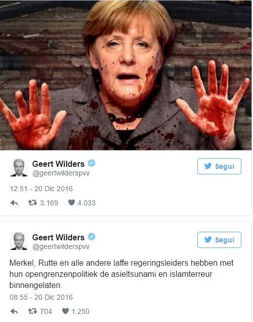 La cancelliera si è recata sul luogo dove almeno dodici persone sono rimaste uccise e 48 ferite, attirando su di se non poche critiche. Il gesto della Merkel che si è detta “triste” e “sconvolta per quanto accaduto”, non ha di certo fermato Wilders che, oltre ad aver raffigurato così la Merkel, ha scritto: “Merkel, Rutte e gli altri leader codardi al governo hanno provocato lo tsunami dell’asilo e del terrorismo islamico aprendo le frontiere”. In un tweet precedente di cui parla anche il Daily Mail, Wilders aveva scritto: “Ci odiano e ci uccidono. E nessuno ci protegge. I nostri leader ci tradiscono. Abbiamo bisogno di una rivoluzione politica. E di difendere la nostra gente”.