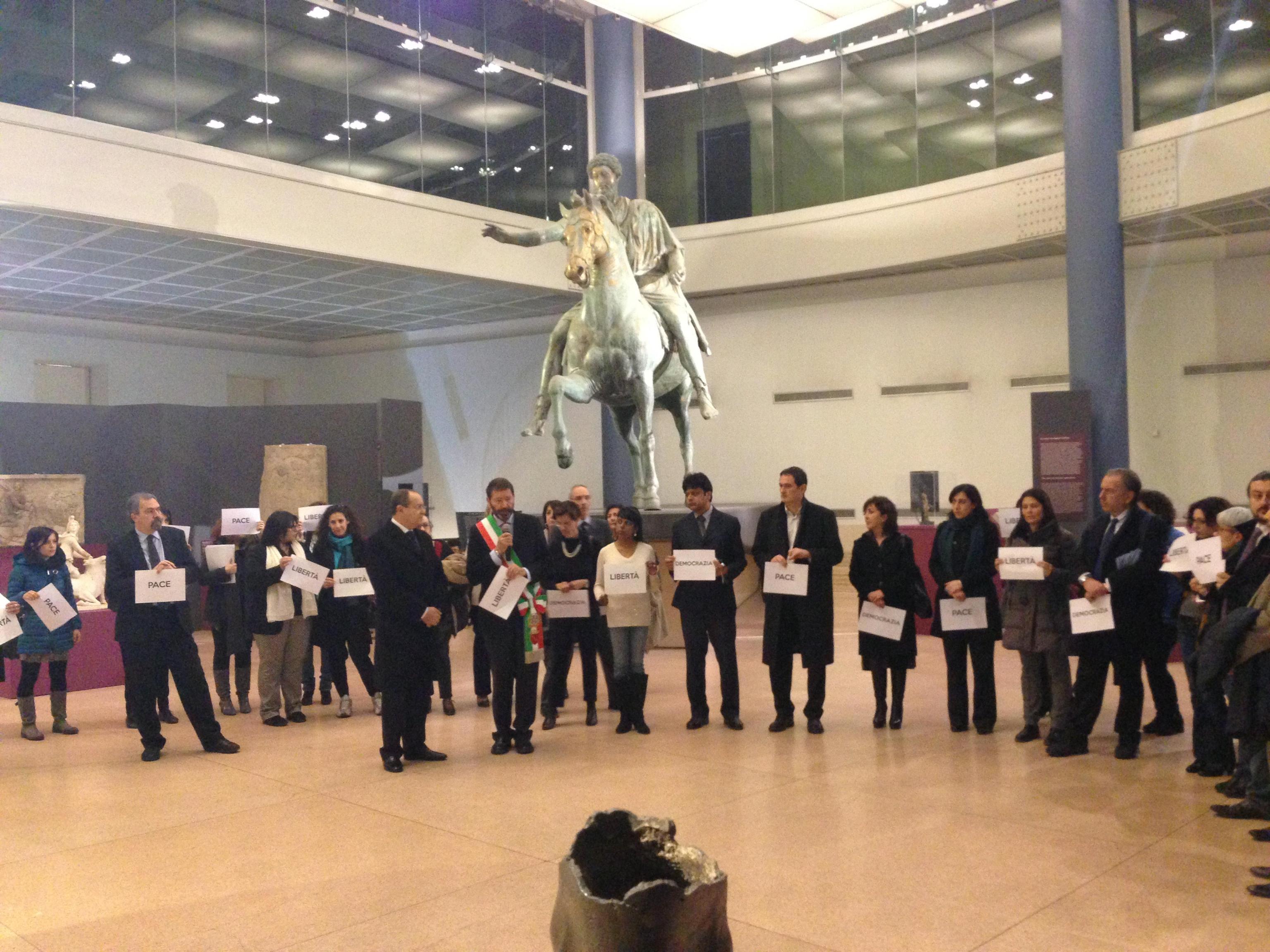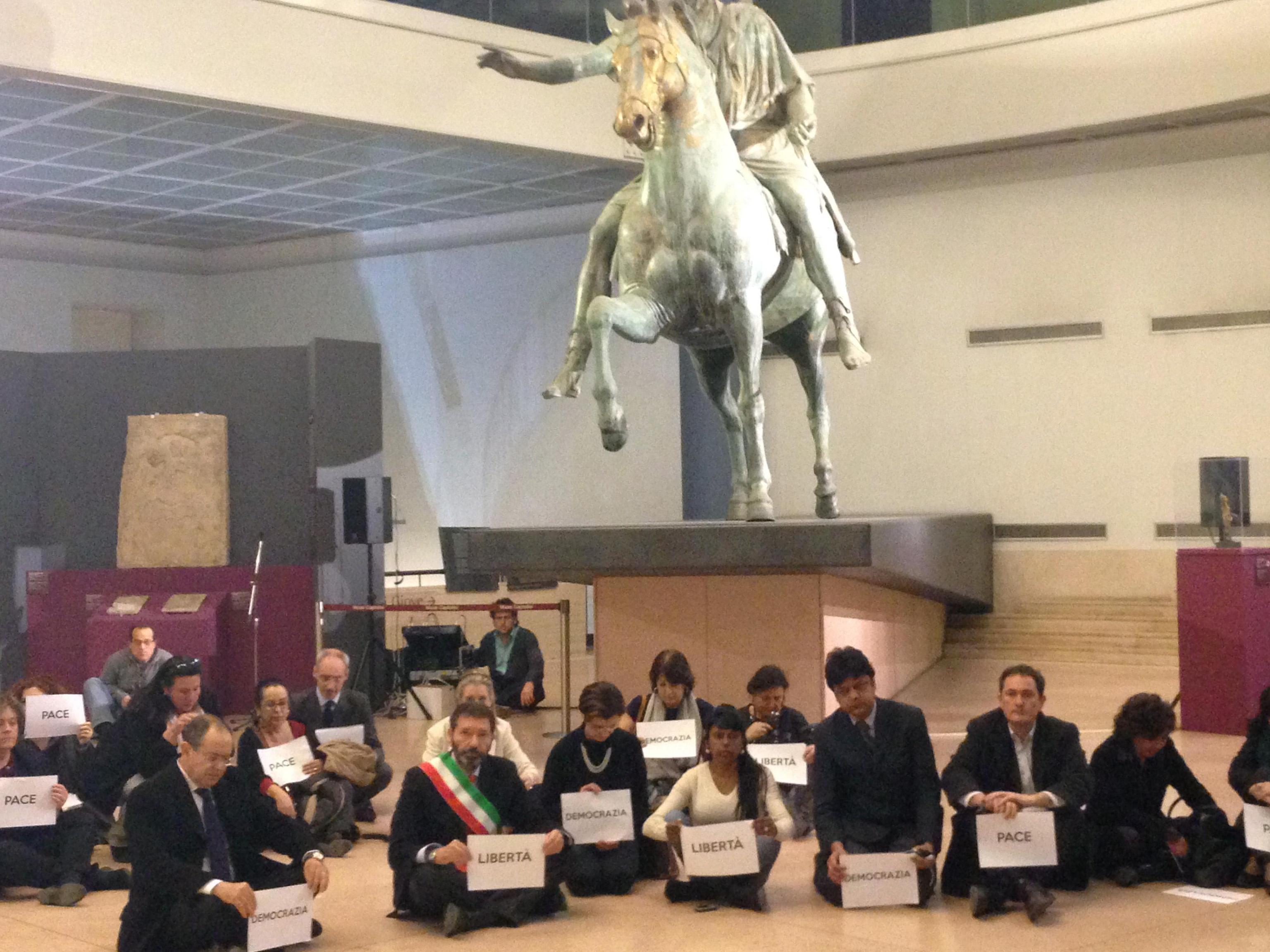 ROMA – Un minuto di silenzio e poi tutti seduti a terra sotto il Marco Aurelio con in mano i cartelli ‘Pace’, ‘Democrazia’ e ‘Libertà’. Questo il flash mob organizzato dal Campidoglio nei Musei Capitolini per ricordare le vittime dell’attacco terroristico al Museo del Bardo di Tunisi. A parteciparvi il sindaco di Roma Ignazio Marino, insieme a molti assessori della sua giunta, e l’ambasciatore della Tunisia in Italia Naceur Mestiri, anche loro seduti per terra come i turisti immortalati durante l’attentato nelle foto girate in tutto il mondo.