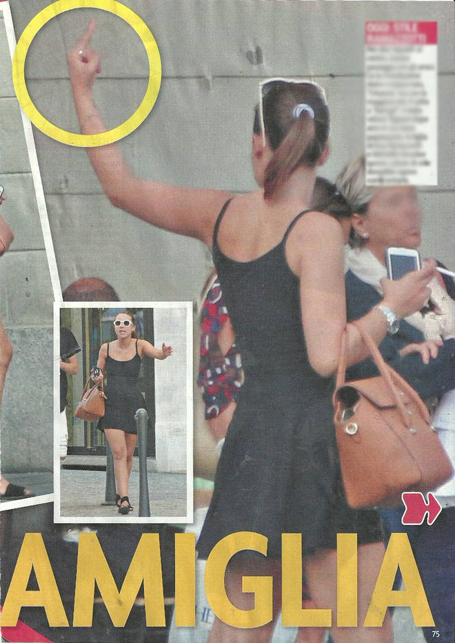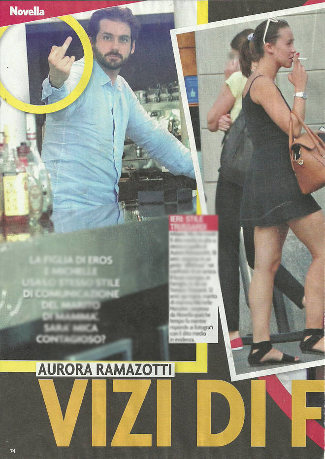 ROMA – Aurora Ramazzotti ancora al centro delle polemiche. La figlia di Michelle Hunziker ed Eros Ramazzotti, viene fotografata da Novella 2000 assieme a delle amiche. I fotografi non l’hanno mollata per qualche ora e lei, infastidita, è stata immortalata dal settimanale di gossip mentre fa un gestaccio diretto al paparazzo appostato, un po’ come aveva fatto il compagno della madre Tomaso Trussardi qualche giorno fa.