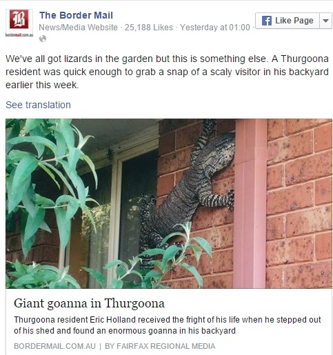 THURGOONA (AUSTRALIA) – Nei giorni scorsi una mega lucertola lunga un metro e mezzo è entrata nel giardino di Eric Holland, un ottantenne australiano residente a Thurgoona, cittadina australiana del Nuova Galles del Sud. L’uomo è rimasto a bocca aperta: davanti a lui si è materializzato un gigantesco goanna, un varano gigante di circa 1,5 metri che si stava arrampicando sul muro di casa sua.