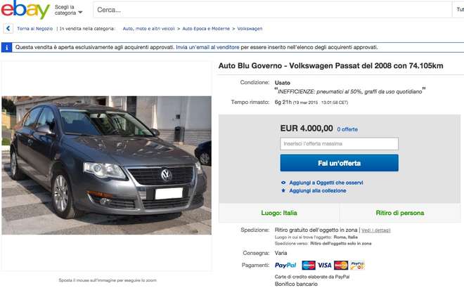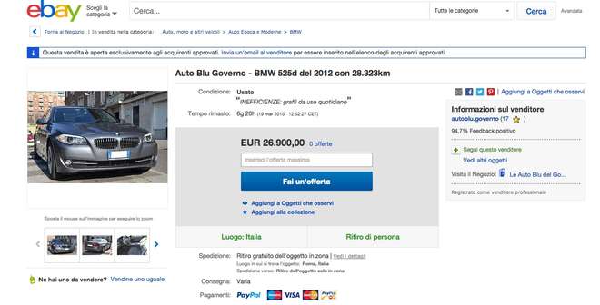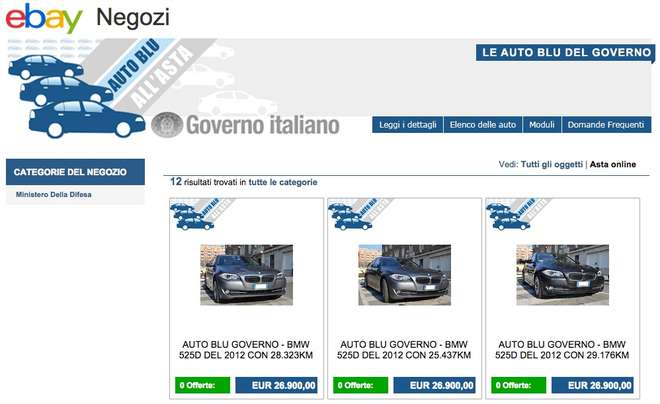 ROMA – Al via la terza sul negozio di eBay del Governo italiano, la vendita dell’ultima tranche della “partita” di 33 auto blu messe all’asta . Si tratta di auto appartenute al ministero della Difesa che per essere vendute sono state divise in tre ‘lotti’: il primo di 10, il secondo di 11 e l’ultimo di 12 macchine.