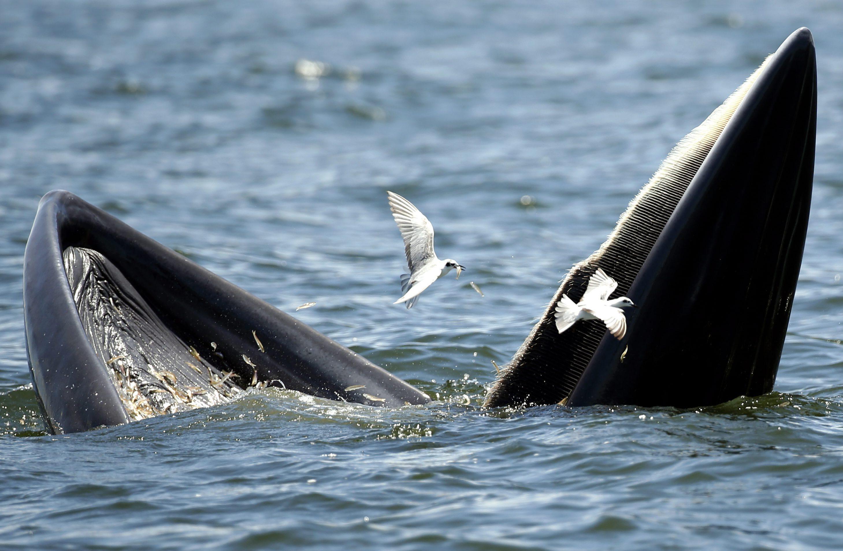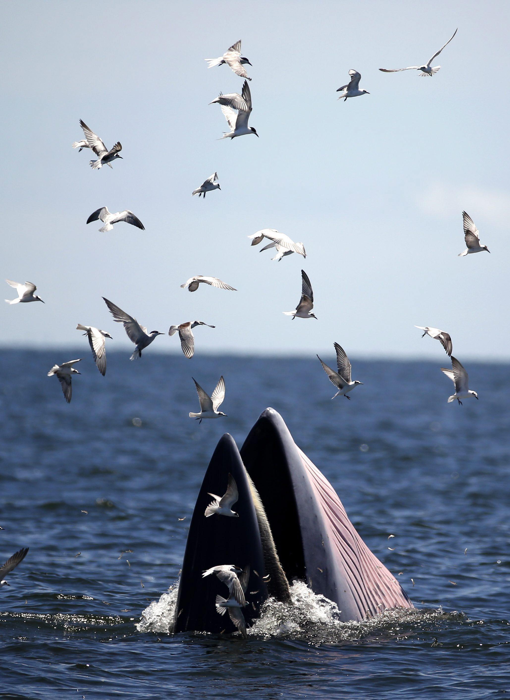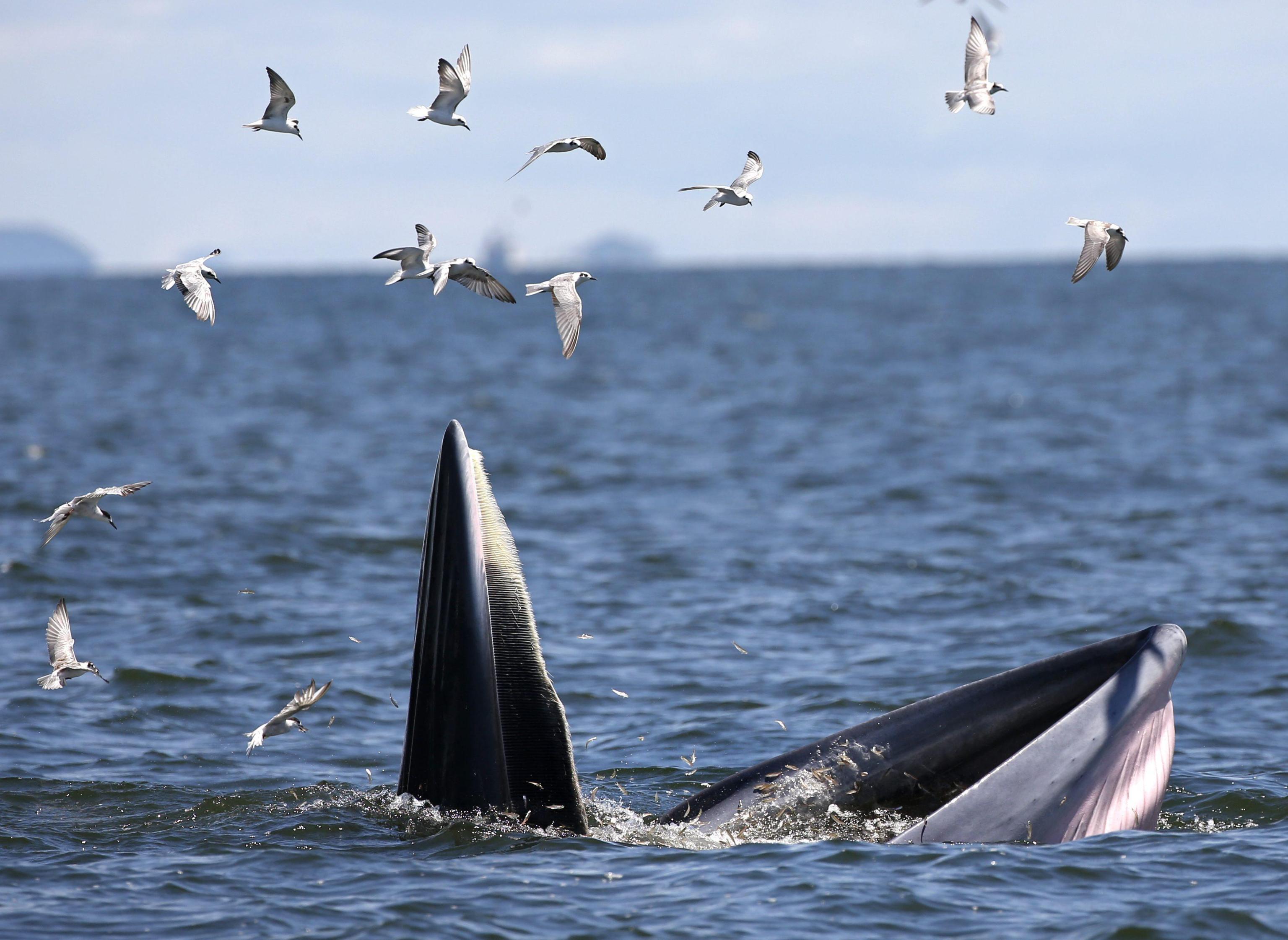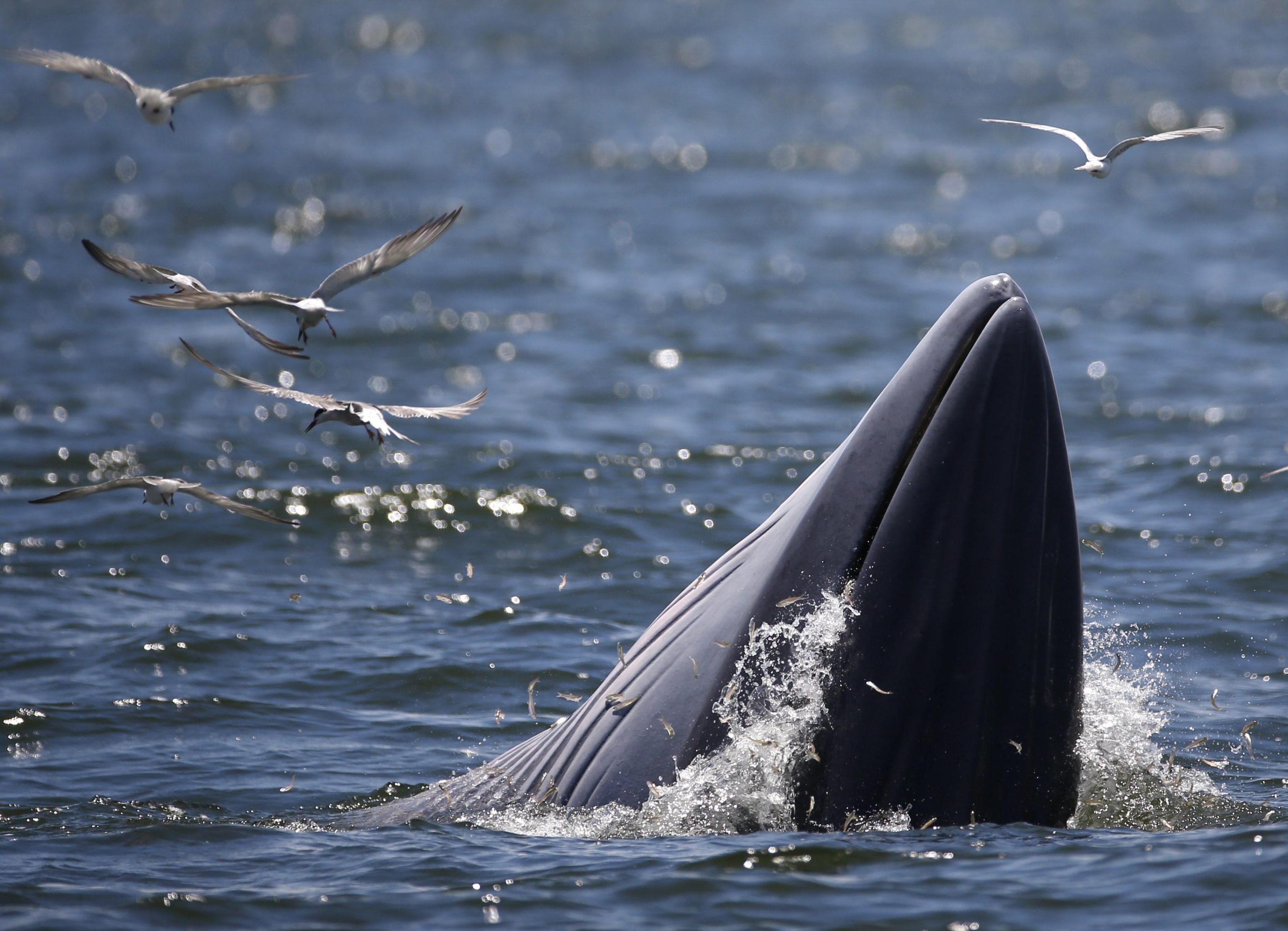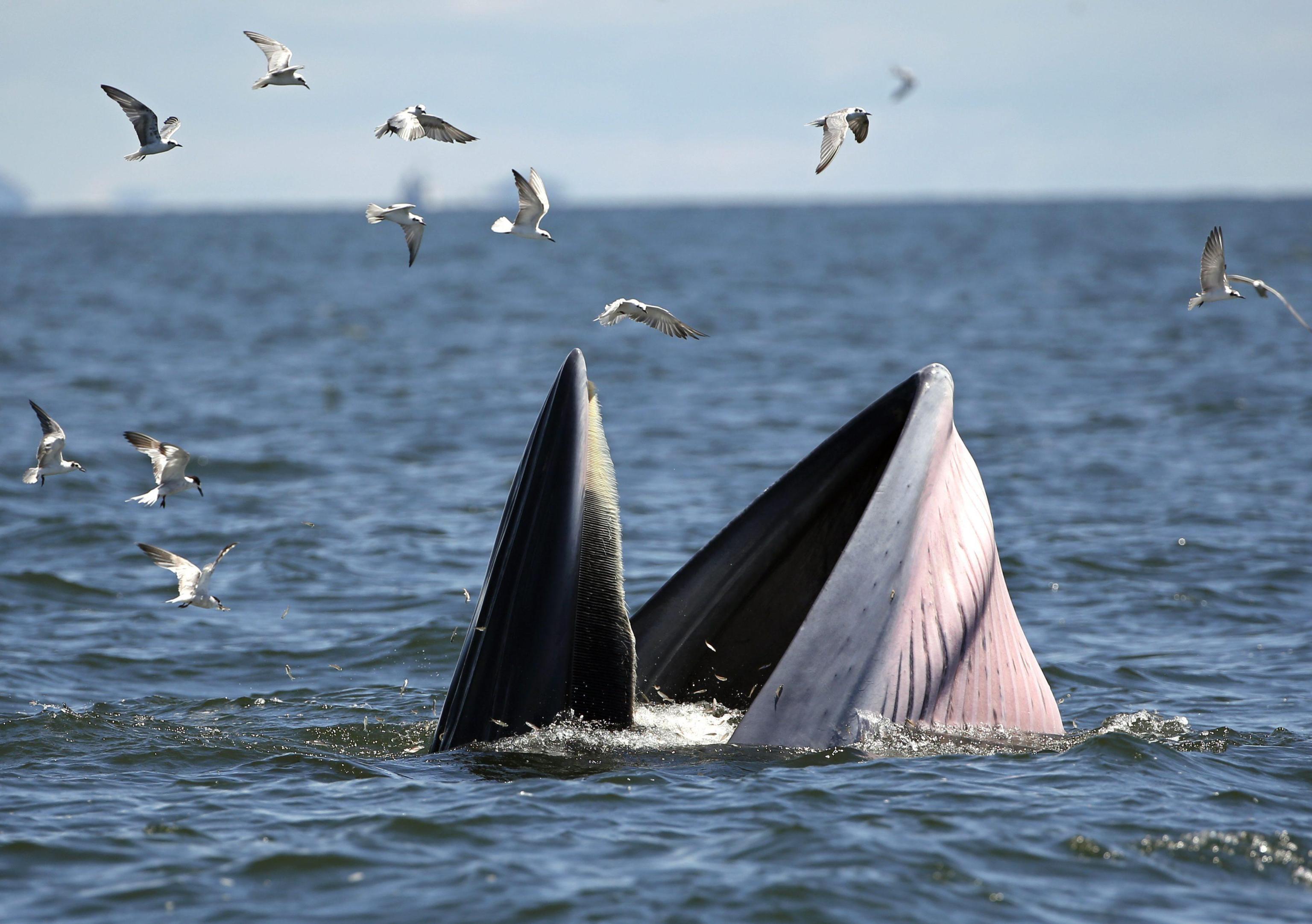 BANGKOK (THAILANDIA) – Una balenottera di Edeni (Balaenoptera brydei) viene ripresa al largo delle coste della Thailandia mentre mangia delle acciughe. L’animale, tra le specie più a rischio estinzione, si nutre di piccoli pesci, pasto che piace anche ai gabbiani che in questo caso ne approfittano per catturarne un po’ tra quello finito nelle grandi fauci di questa balenottera.