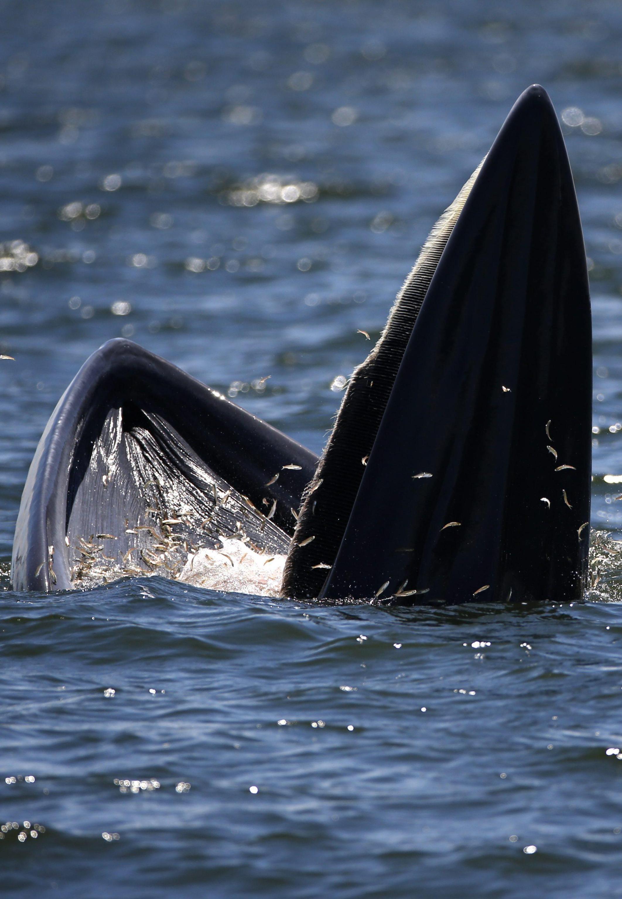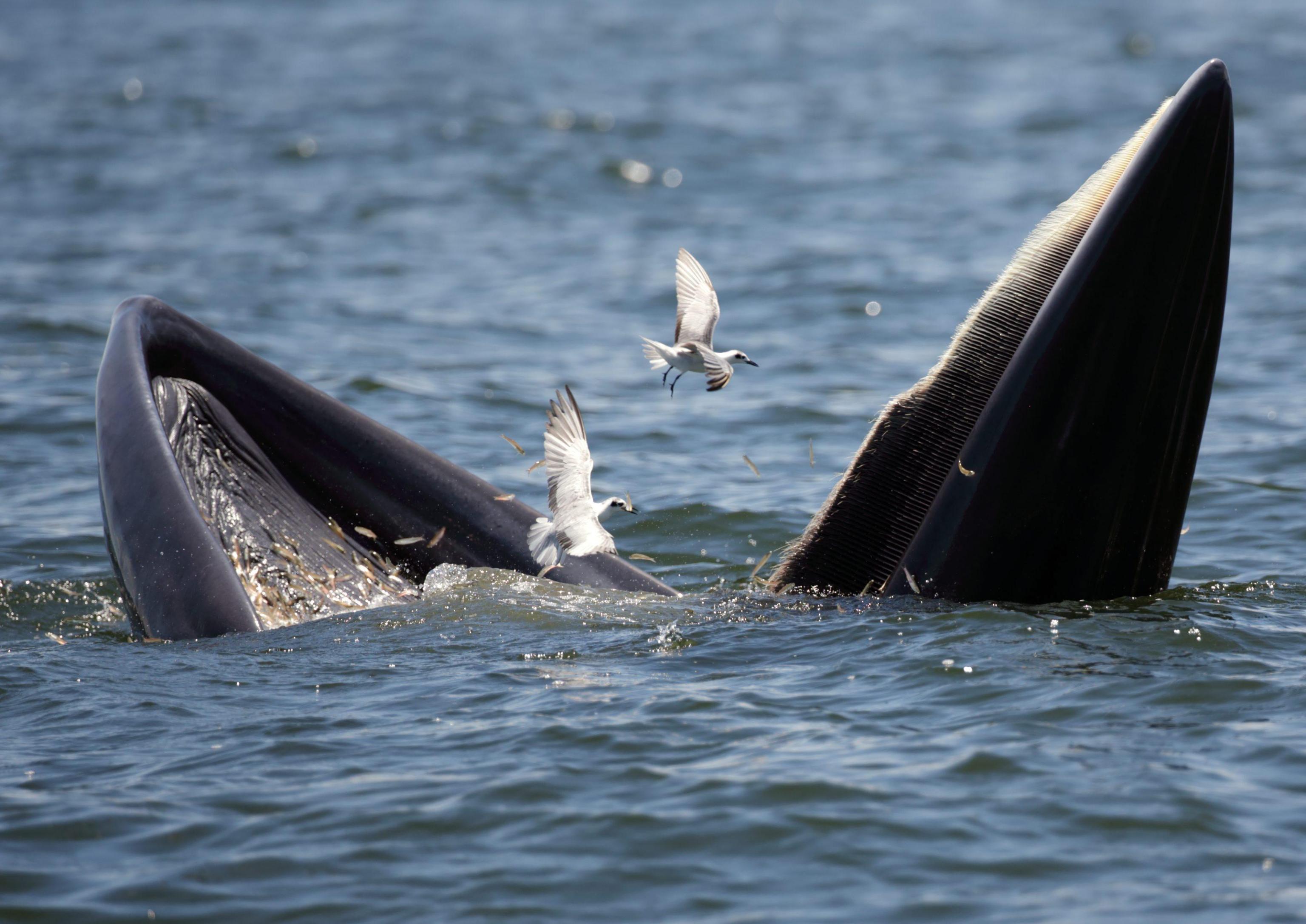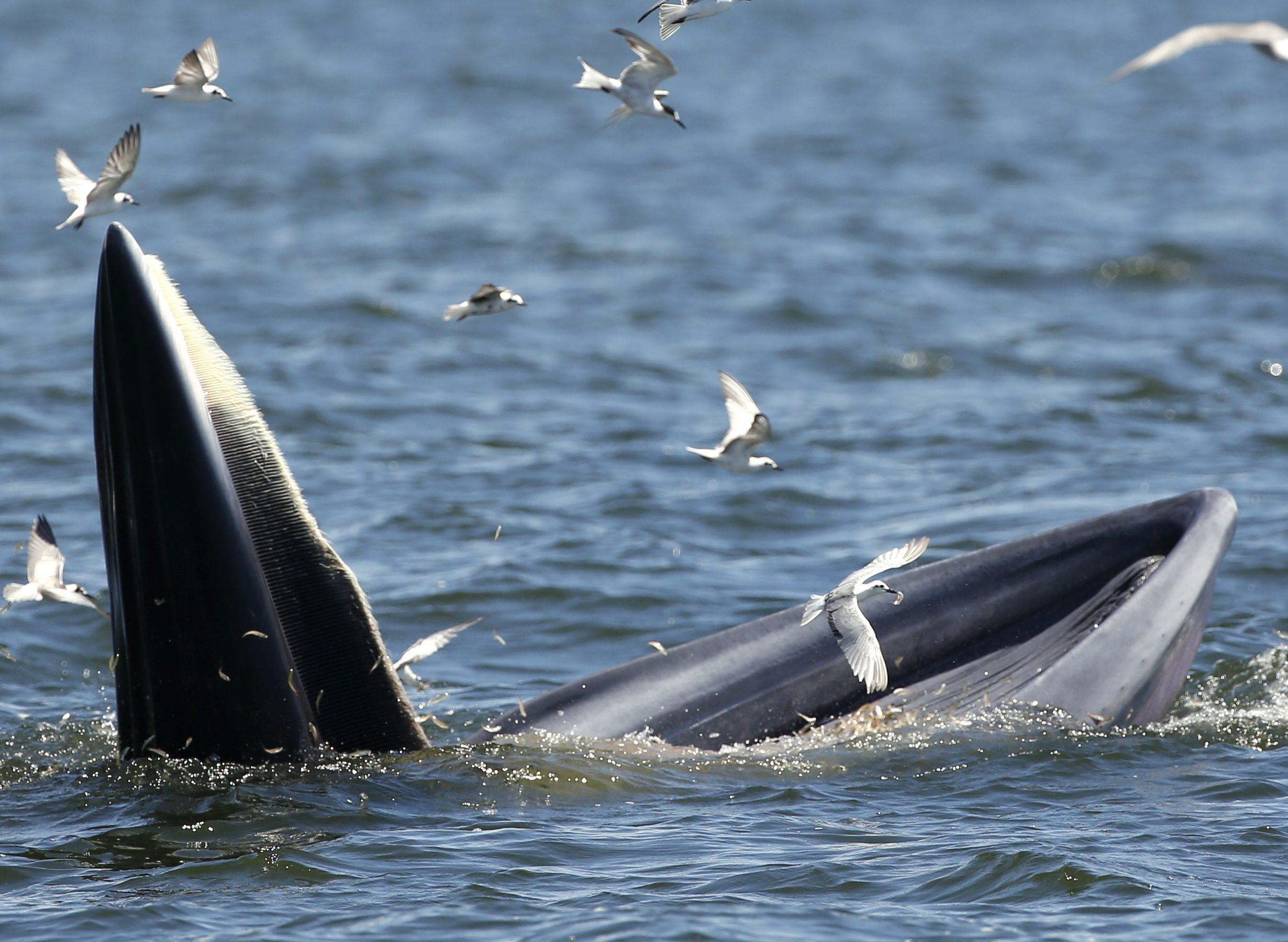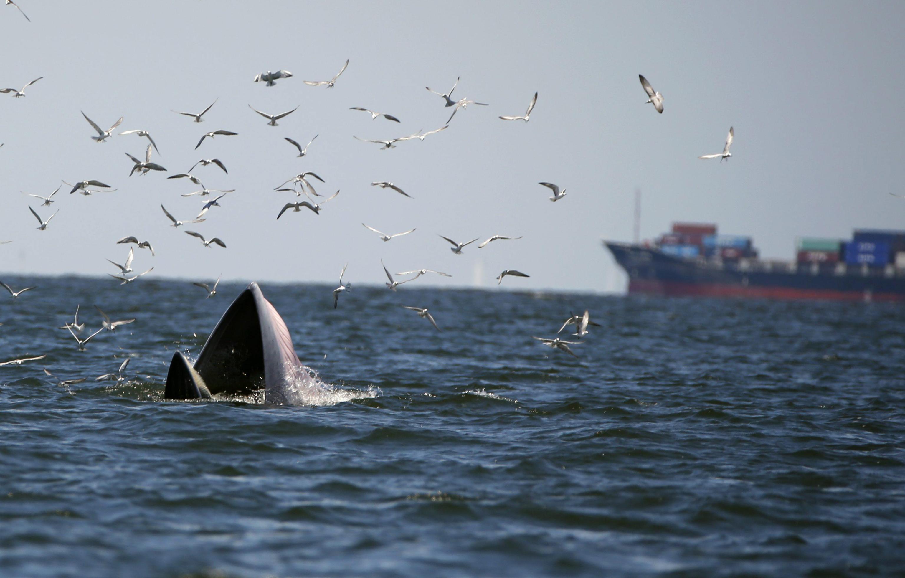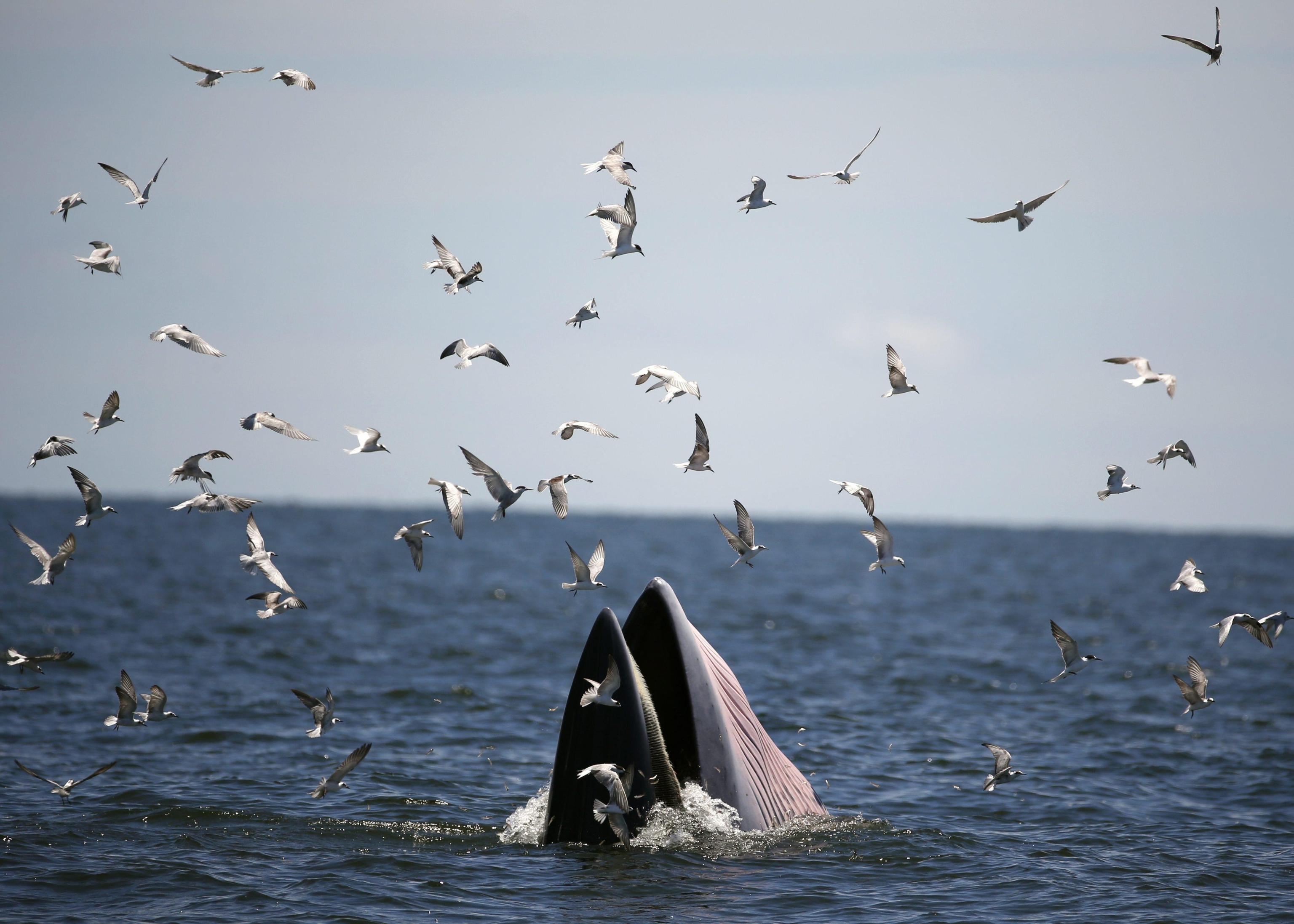 BANGKOK (THAILANDIA) – Una balenottera di Edeni (Balaenoptera brydei) viene ripresa al largo delle coste della Thailandia mentre mangia delle acciughe. L’animale, tra le specie più a rischio estinzione, si nutre di piccoli pesci, pasto che piace anche ai gabbiani che in questo caso ne approfittano per catturarne un po’ tra quello finito nelle grandi fauci di questa balenottera.