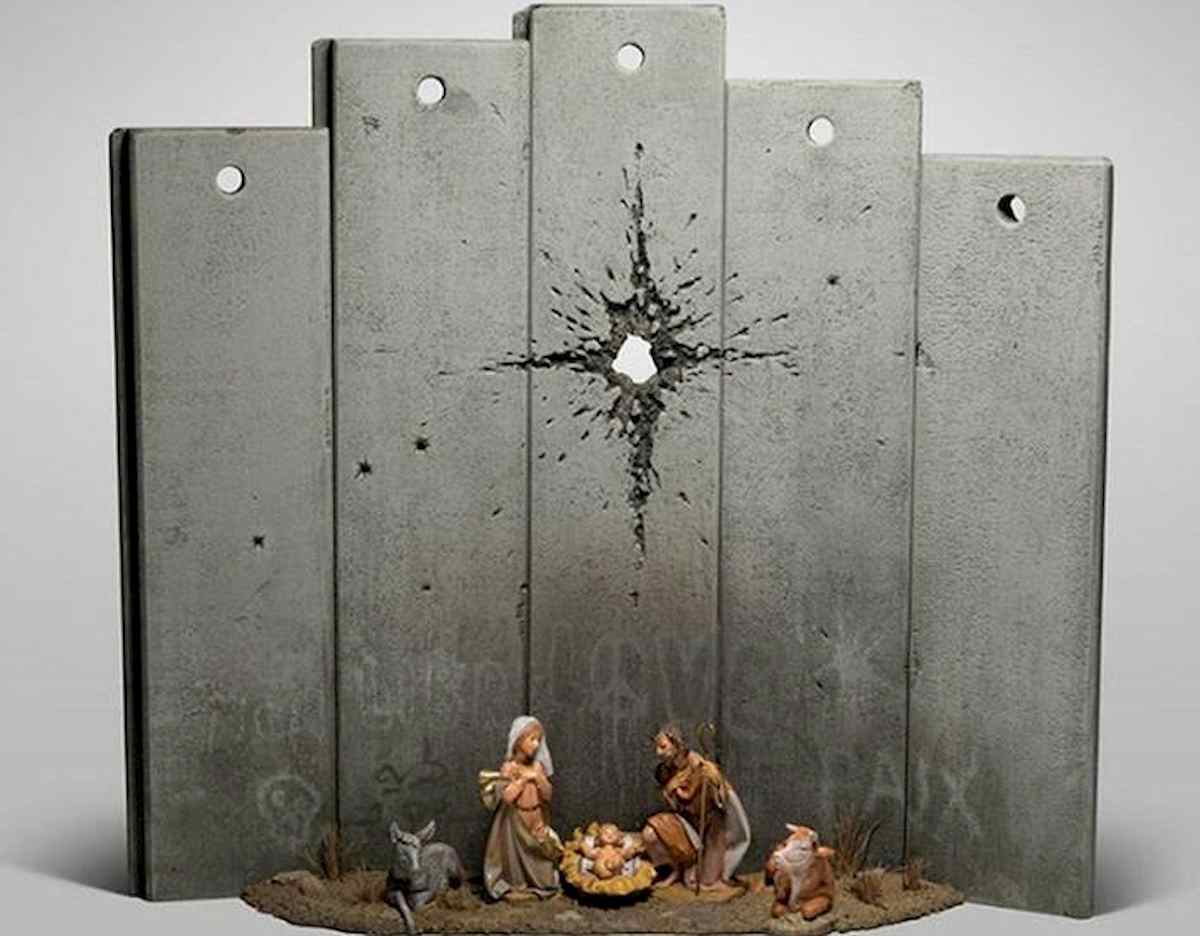 Si intitola “La cicatrice di Betlemme” ed è esposta all’entrata dell’albergo Walled Off che il misterioso artista britannico ha aperto nel 2017 a ridosso del Muro fatto costruire da Israele per separare la città palestinese dai territori di Gerusalemme Est. Nella natività di Banksy, la Madonna, San Giuseppe e il Bambin Gesù sono retroilluminati e poggiati a un muro “ferito” da una granata. Sui blocchi di cemento si intravedono scritte graffiate che inneggiano all’amore, alla pace e alla libertà.