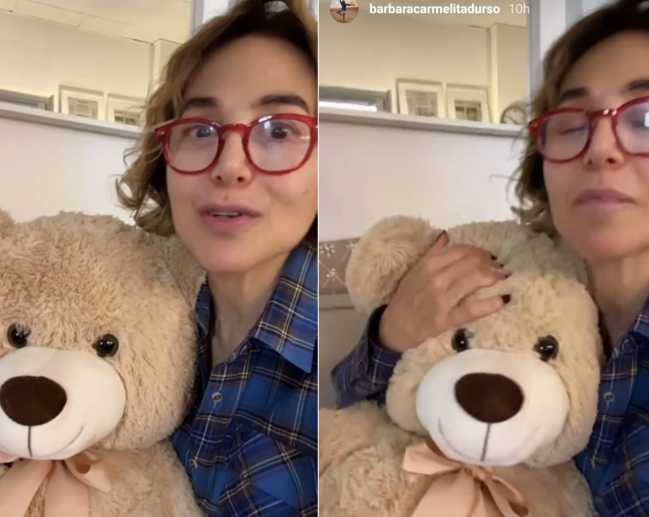 E’ abbracciata a un vecchio amico: il suo orsacchiotto di peluche, già protagonista di molti suoi selfie. Barbara D’Urso, 63 anni, senza trucco e coi capelli spettinati, sembra quasi una ragazzina.
