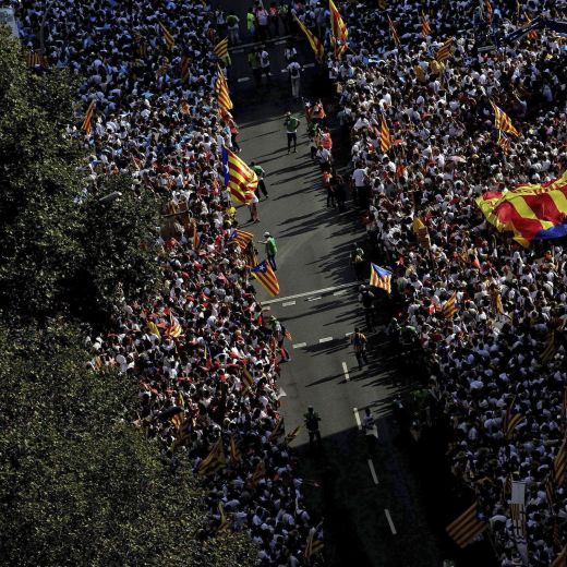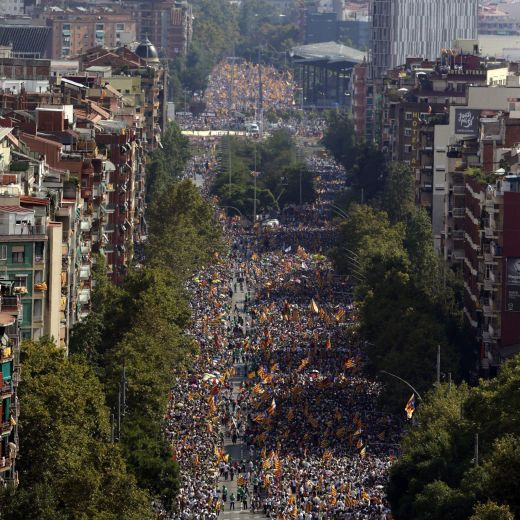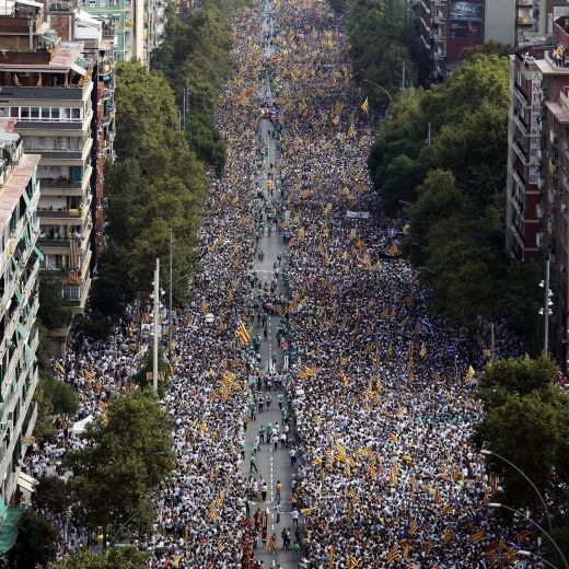 Lungo i 5 km della Meridiana la folla – oltre un milione per gli organizzatori – vestita di bianco, con in mano cartoni multicolori per formare un mosaico, è stata attraversata da una enorme punta di freccia gialla portata da 20 atleti, simbolo del cammino della Catalogna verso l’indipendenza. “Siamo a un passo dalla vittoria” ha detto alla folla davanti al Parlament il presidente dell’Assemblea Nazionale Catalana Jordi Sanchez: “stiamo facendo una rivoluzione senza paragoni in Europa. E lo faremo nelle urne, sorprendendo il mondo. Vogliamo il nostro stato. Non vogliamo continuare a fare parte un minuto di più del regno di Spagna”.