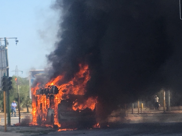 Il mezzo è ora fermo all’incrocio con viale Europa e sono attualmente in corso le operazioni di spegnimento dell’incendio da parte dei vigili del fuoco. Sul posto ci sono tre squadre di pompieri, pattuglie di polizia municipale e un’ambulanza. Non risultano feriti ma il fumo nero si sta propagando velocemente raggiungendo anche i piani più alti dei palazzi circostanti. La gente del quartiere è accorsa in strada perché attirata dal rumore di una esplosione ed anche perché il fumo ha raggiunto i piani alti dei palazzi.
