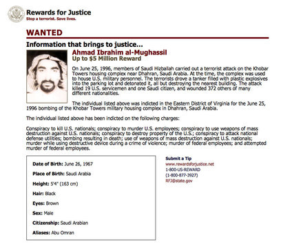 L’FBI riteneva Ahmed al-Mughassil, il numero uno dell’esercito degli Hezbollah sauditi. Al-Mughassil era arrivato dall’Iran due giorni prima: l’Fbi, per la sua cattura avvenuta quasi dopo 20 anni, aveva messo su di lui una taglia da 5 milioni di dollari.