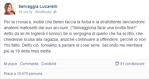 E aggiunto: “Per la cronaca, inutile che Belen faccia la furba e la strafottente lanciandomi anatemi mafiosetti dal suo account. (“Selvaggiona farai una brutta fine!” detto da lei mi toglierà il sonno) Se si vergogna di quello che ha scritto, che chiedesse scusa alla ragazza, anziché continuare a offendere, perché io non l’ho fatto. Detto ciò, torniamo a parlare di cose serie. Secondo me meritava più la 19 della miss eletta”, chiudendo: “Io invidio i cervelli, non le taglie 38.”