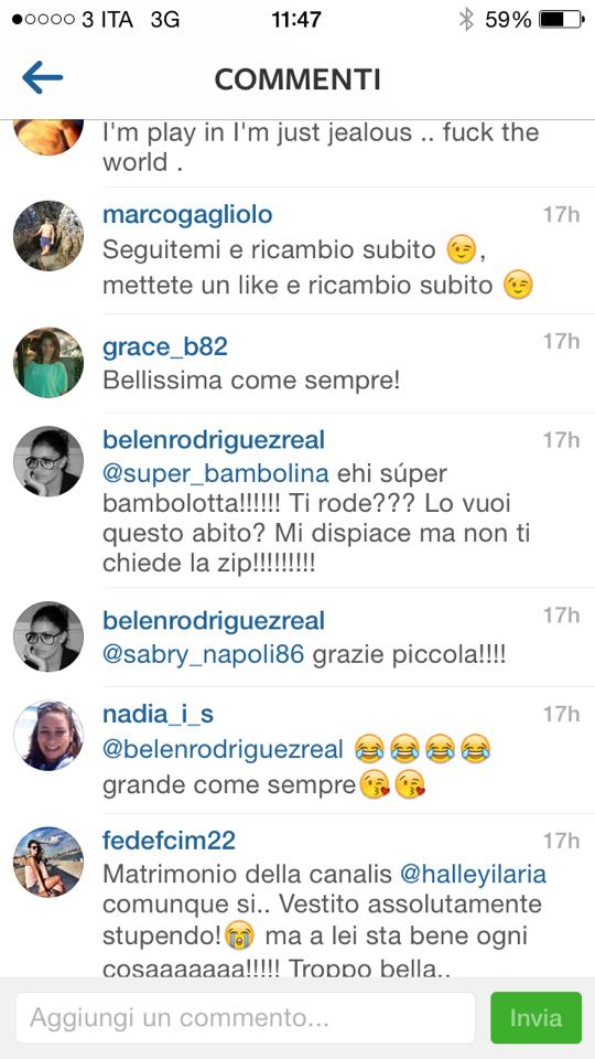 Commenti che Belen non ha gradito, tanto da rispondere in maniera molto pesante a una ragazza, il cui nick è super_bambolina: “Ehi super bambolotta! Ti rode? Lo vuoi questo abito? Mi dispiace ma non ti si chiude la zip”. Anche se della ragazza Belen non conosce l’aspetto (“questa persona non ha mai pubblicato nessuna sua fotografia, mai nulla, quindi io non so come sia fatta…..”).