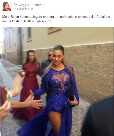 Anche a Selvaggia Lucarelli, che aveva criticato l’abito della showgirl argentina (“Ma a Belen hanno spiegato che era il matrimonio in chiesa della Canalis e non la finale di Notti sul ghiaccio?”) l’intervento non è piaciuto.