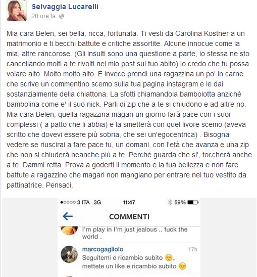 Selvaggia Lucarelli, sulla sua pagina Facebook, ha pubblicato uno screenshot del commento, scrivendo: “Mia cara Belen, sei bella, ricca, fortunata. Ti vesti da Carolina Kostner a un matrimonio e ti becchi battute e critiche assortite. Alcune innocue come la mia, altre rancorose. (Gli insulti sono una questione a parte, io stessa ne sto cancellando molti a te rivolti nel mio post sul tuo abito) Io credo che tu possa volare alto. Molto molto alto. E invece prendi una ragazzina un po’ in carne che scrive un commentino scemo sulla tua pagina instagram e le dai sostanzialmente della chiattona. La sfotti chiamandola bambolotta anziché bambolina come e’ il suo nick. Parli di zip che a te si chiudono e ad altre no. Mia cara Belen, quella ragazzina magari un giorno farà pace con i suoi complessi (a patto che li abbia) e la smetterà con quel livore scemo (aveva scritto che dovevi essere più sobria, che sei un’egocentrica). Bisogna vedere se riuscirai a fare pace tu, un domani, con l’età che avanza e una zip che non si chiuderà neanche più a te. Perché guarda che sì, toccherà anche a te. Dammi retta. Prova a goderti il momento e la tua bellezza e non fare battute a ragazzine che magari non mangiano per entrare nel tuo vestito da pattinatrice. Pensaci”.