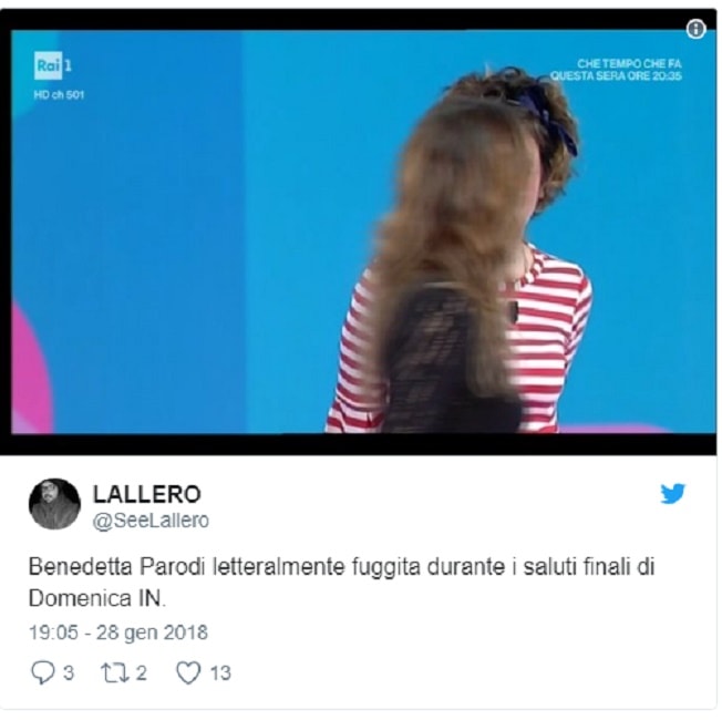 Come si vede in alcune clip che rimbalzano sui social, la Cristina non ha fatto in tempo a salutare il pubblico e dare appuntamento alla prossima settimana che Benedetta già era fuori dall’inquadratura e raggiungeva a passo sostenuto l’uscita. E sul web si sprecano foto e commenti. Sull’account @See Lallero si legge ad esempio: “Benedetta Parodi letteralmente fuggita durante i saluti finali di Domenica In”.