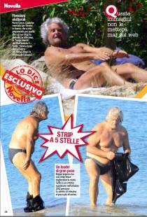 OLBIA – Dopo le foto al mare in bikini della bella ministra delle Riforme, Maria Elena Boschi, e il topless della titolare dell’Istruzione, Stefania Giannini, ora tocca a Beppe Grillo finire sotto l’impietoso obiettivo dei paparazzi. Per par condicio, oseremmo dire, questa volta è il lato b del leader M5s a occupare le foto a tutta pagina del settimanale Novella 2000, sfortunatamente senza photoshop.