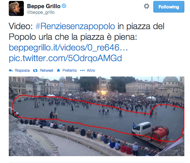 La foto mostra una parte della piazza semivuota, proprio quando il premier dal palco dice: “Oggi vi dimostriamo che il popolo è in piazza e la piazza è casa nostra”. Grillo nella foto ha segnalato con un tratto rosso l’area vuota. Oltre a questa immagine, altri utenti Twitter hanno pubblicato foto simili: