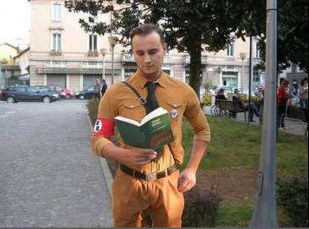 A Bergamo, l’iniziativa organizzata da esponenti ultra cattolici e del movimento di estrema destra Forza Nuova, è stata segnata da un fuori programma: un trentenne si è presentato con la divisa dei “nazisti dell’Illinois”, tratta dal film dei Blues Brothers con Dan Aykroyd e John Belushi protagonisti. Una divisa con una doppia citazione: al braccio porta la doppia X che Charlie Chaplin ne Il Grande Dittatore indossa come simbolo nazista. Come libro, la scelta ricade sul Mein Kampf di Adolf Hitler.