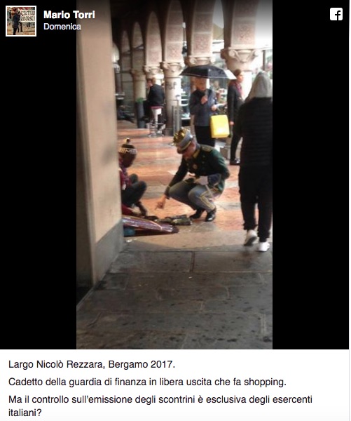 BERGAMO – Un cadetto della Guardia di Finanza che fa compere dal venditore abusivo. O almeno questo è quel che sembra da una foto pubblicata su Facebook da Mario Torri. E la data non è casuale: la foto sarebbe stata scattata il 7 maggio a Bergamo. Proprio quella domenica in città si è svolta la cerimonia di giuramento degli Allievi Ufficiali del 116° Corso Dobrej IV e del 15° Corso Ruolo Aeronavale Cigno della Guardia di Finanza.