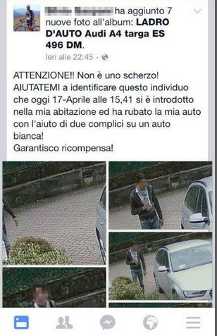Il post del derubato recitava: “ATTENZIONE!! Non è uno scherzo! AIUTATEMI a identificare questo individuo che oggi 17-Aprile alle 15,41 si è introdotto nella mia abitazione ed ha rubato la mia auto con l’aiuto di due complici su un auto bianca! Garantisco ricompensa!” E, dopo il ritrovamento Gaspani ha voluto ringraziare quanti avevano messo un like sul suo posto: “UN ENORME GRAZIE ed è per le vostre +20.000 condivisioni che l’auto è tornata al suo posto. Le forze dell’ordine l’hanno ritrovata poco fà abbandonata con un CURIOSO BIGLIETTO che ho condiviso! Adesso spero che le indagini continuino il loro corso e i colpevoli vengano identificati! GRAZIE A TUTTI”.