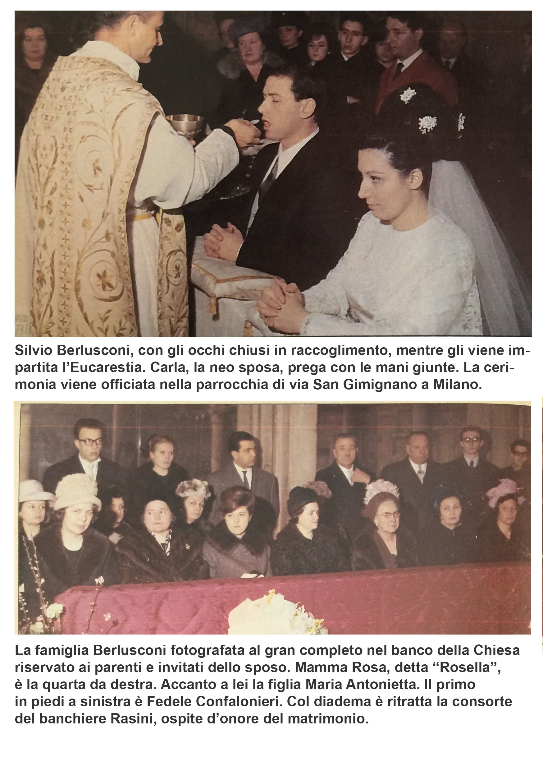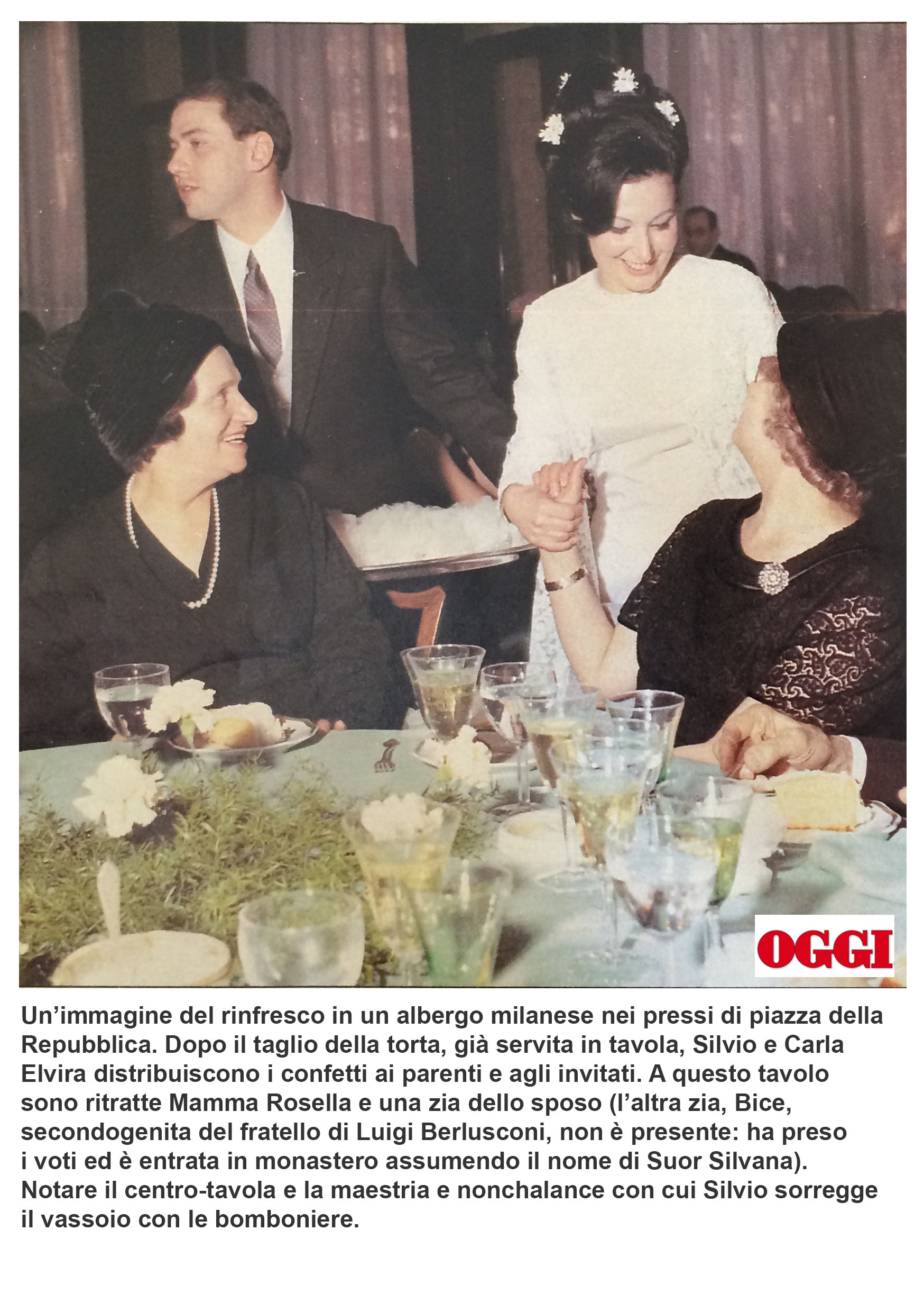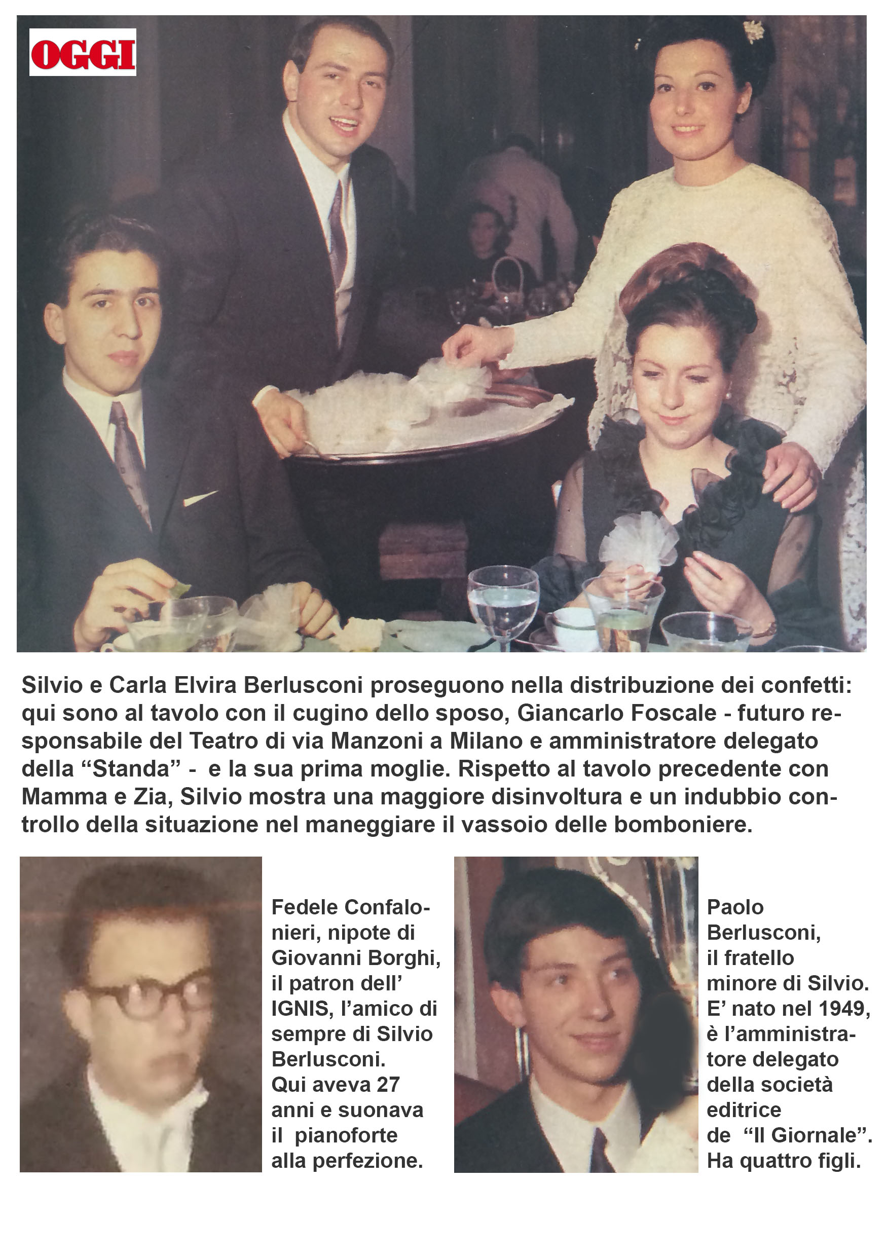 “le fotografie sono state pubblicate dal settimanale “Oggi” nell’agosto del 1995. Ma, in questi vent’anni non sono state stranamente mai più pubblicate, nemmeno, ad esempio, quando si parlava di imminenti nozze con la Pascale (ad esempio, col titolo “Il sogno di Francesca”). Ho voluto pubblicarle poiché temo che quelle foto non si trovino più nell’archivio della RCS e possano essere scomparse magari su intervento o consiglio di Mity Simonetto, l’incaricata di “ritirare” nelle varie redazioni e nelle agenzie le foto sgradite all’ex-Cavaliere. Comunque sia quelle foto vanno riproposte poiché inducono a molte riflessioni, la più importante delle quali è la seguente: come è possibile, vista la modestia e la “normalità” di quella festa di matrimonio celebratasi nel marzo del 1965, che solo pochissimi anni dopo Berlusconi fosse già uno degli uomini più ricchi d’Italia?”.