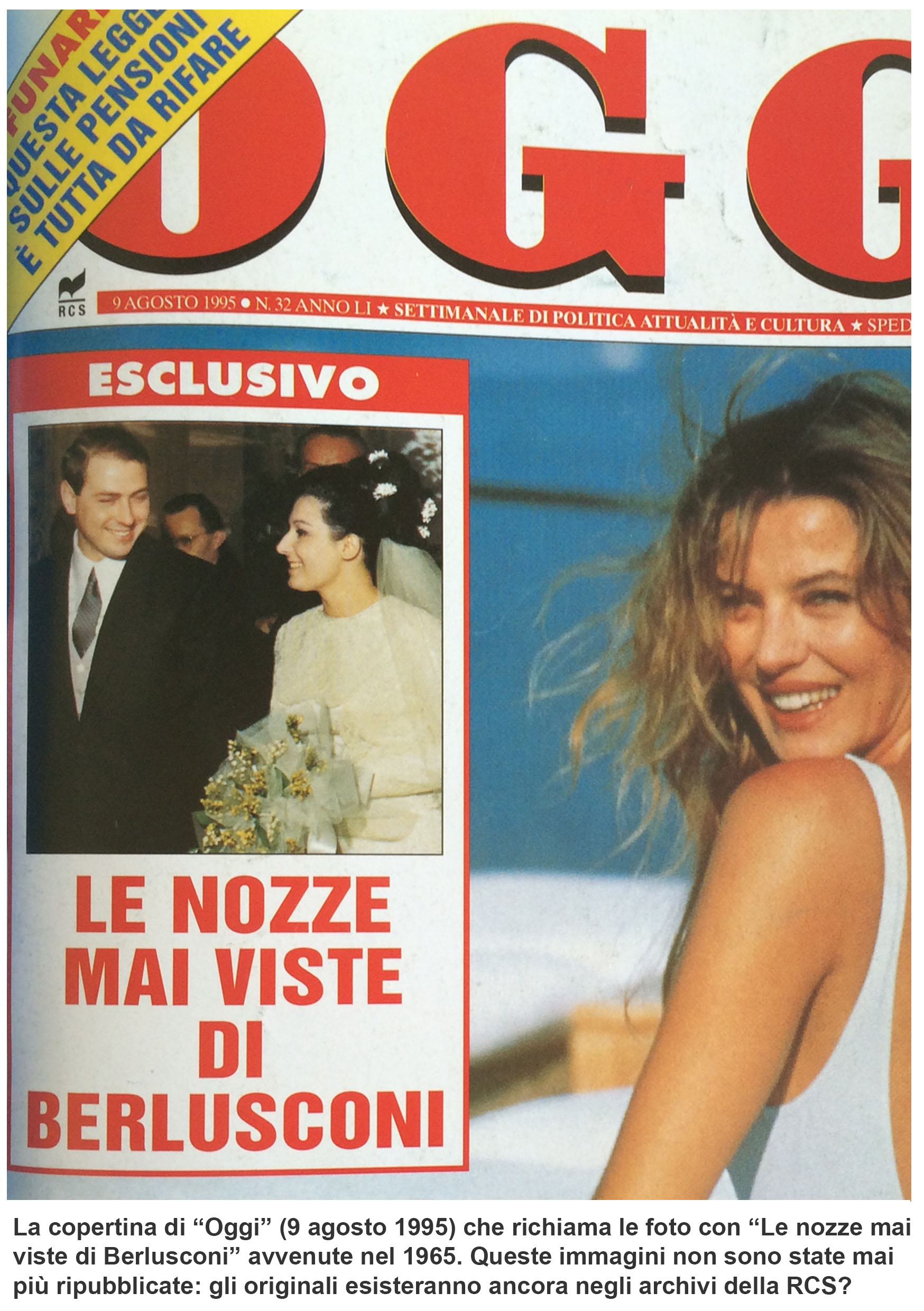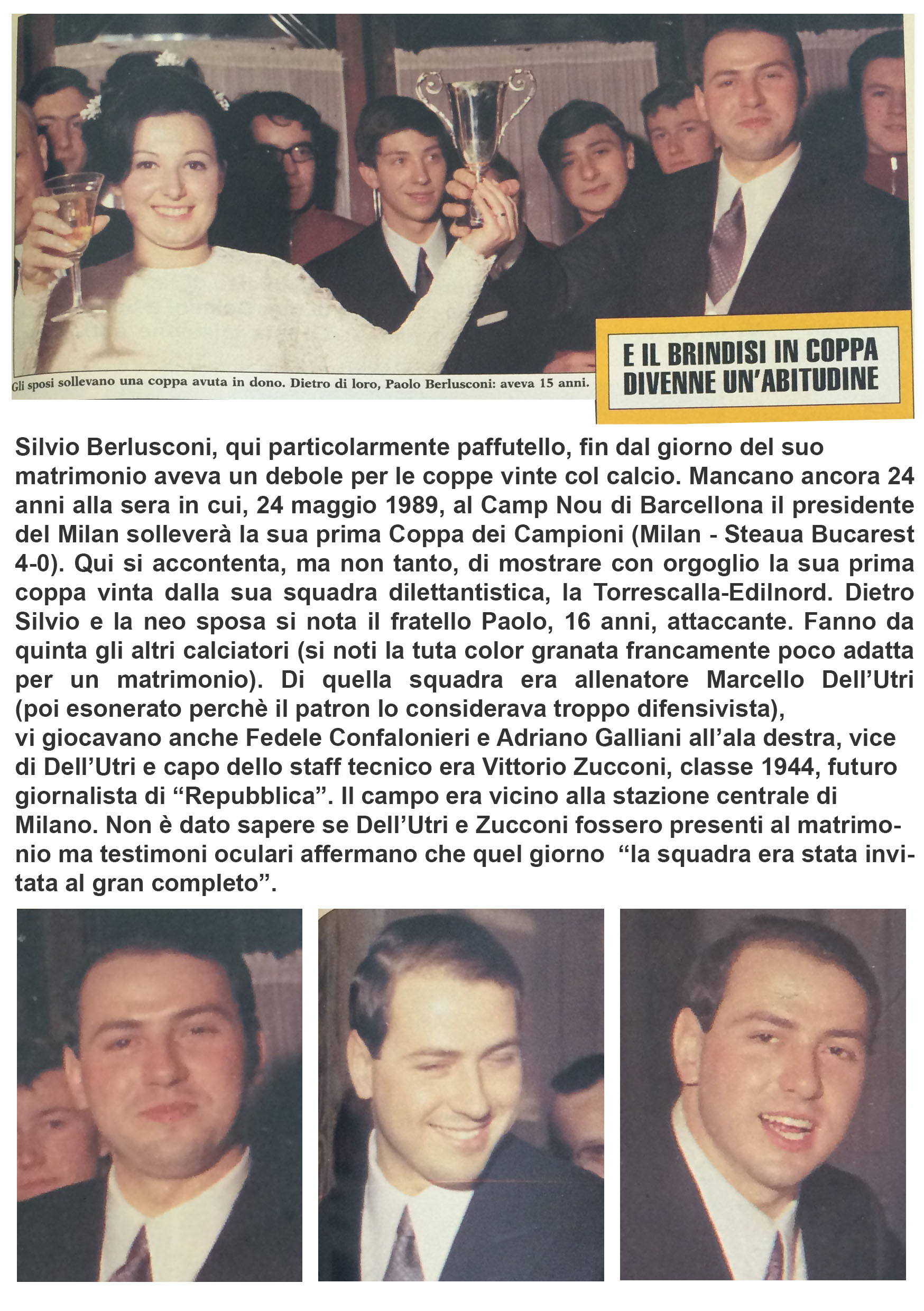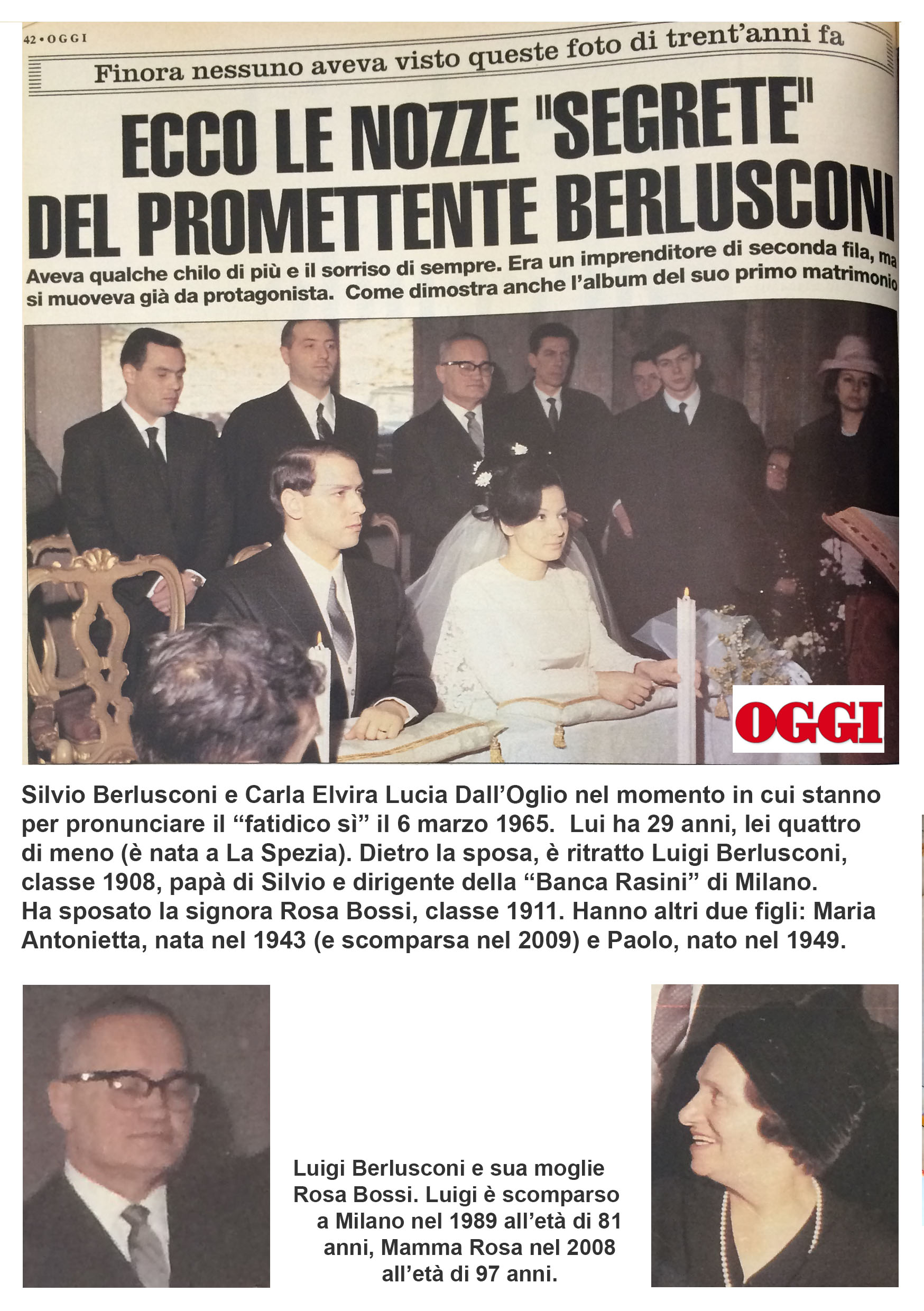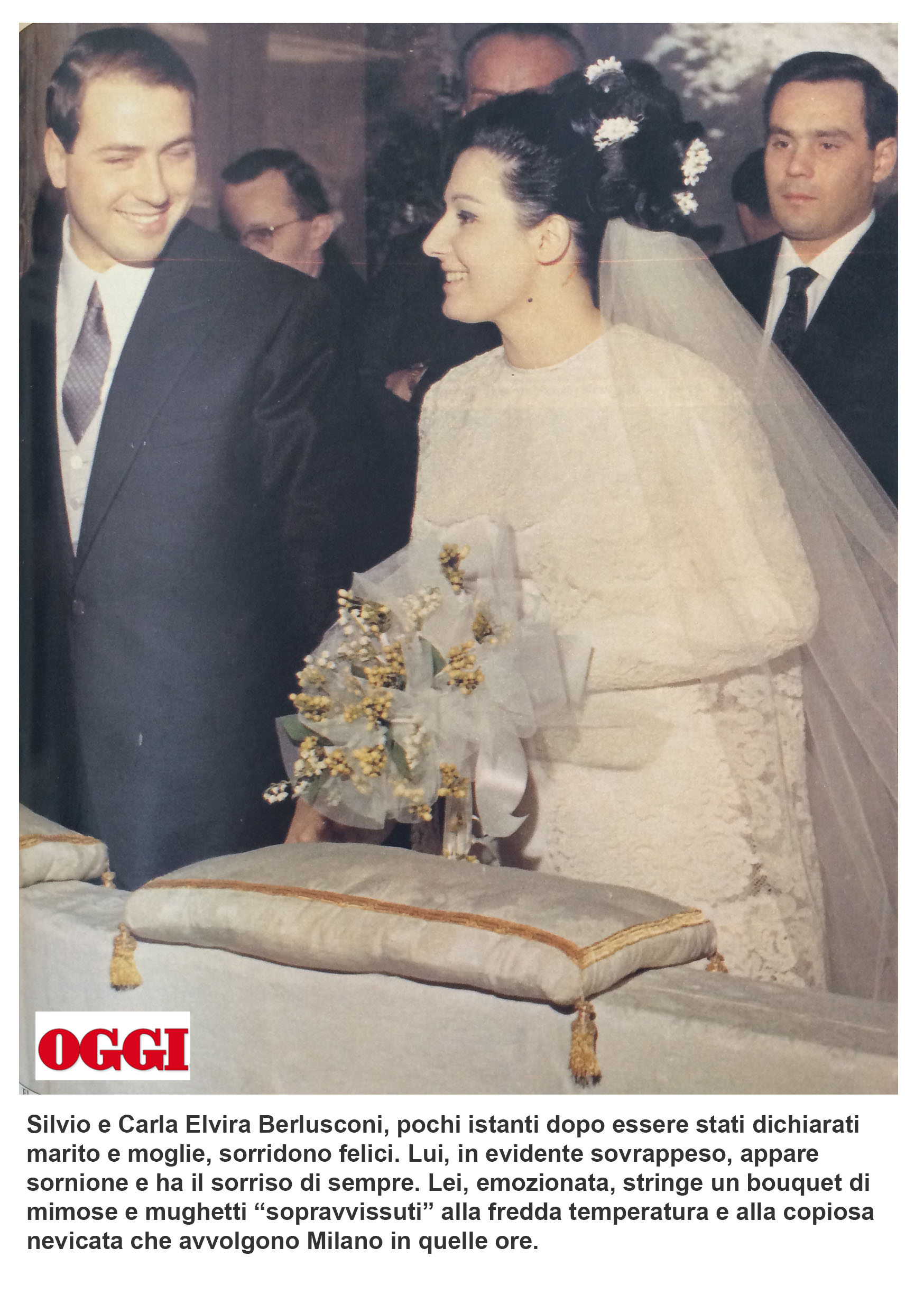 “le fotografie sono state pubblicate dal settimanale “Oggi” nell’agosto del 1995. Ma, in questi vent’anni non sono state stranamente mai più pubblicate, nemmeno, ad esempio, quando si parlava di imminenti nozze con la Pascale (ad esempio, col titolo “Il sogno di Francesca”). Ho voluto pubblicarle poiché temo che quelle foto non si trovino più nell’archivio della RCS e possano essere scomparse magari su intervento o consiglio di Mity Simonetto, l’incaricata di “ritirare” nelle varie redazioni e nelle agenzie le foto sgradite all’ex-Cavaliere. Comunque sia quelle foto vanno riproposte poiché inducono a molte riflessioni, la più importante delle quali è la seguente: come è possibile, vista la modestia e la “normalità” di quella festa di matrimonio celebratasi nel marzo del 1965, che solo pochissimi anni dopo Berlusconi fosse già uno degli uomini più ricchi d’Italia?”.