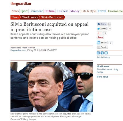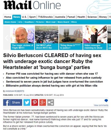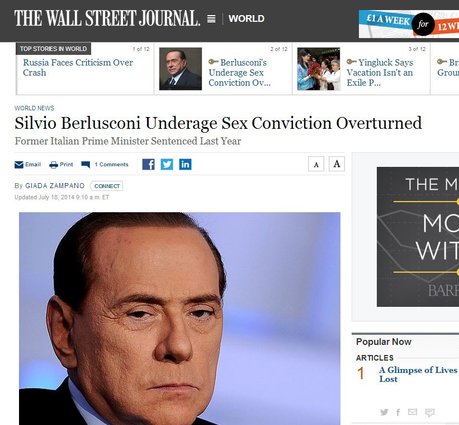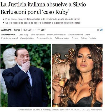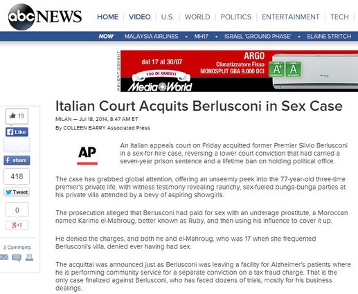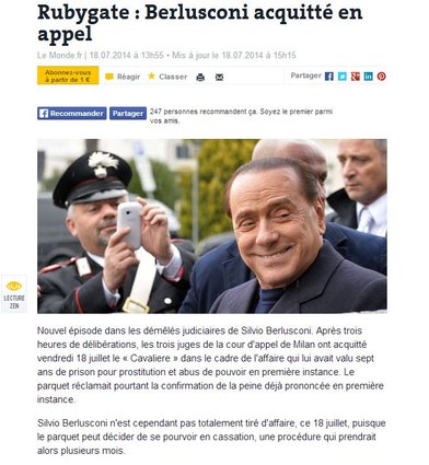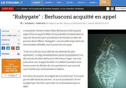 Le Figaro ha informato i suoi lettori inserendo la sentenza nelle notizie ‘flash’: “Ruby gate: Berlusconi prosciolto in appello”. Accompagnando la notizia con una foto dell’ex premier e della giovane marocchina Karima El Marough a una festa, El Pais informa che “la giustizia italiana assolve Silvio Berlusconi per il ‘caso Ruby'”. Complessivamente lo spazio sui media internazionali non è stato tantissimo, in una giornata in cui le prime pagine sono dominate dall’offensiva terrestre a Gaza e dall’abbattimento dell’aereo di linea della Malaysia Airlines.