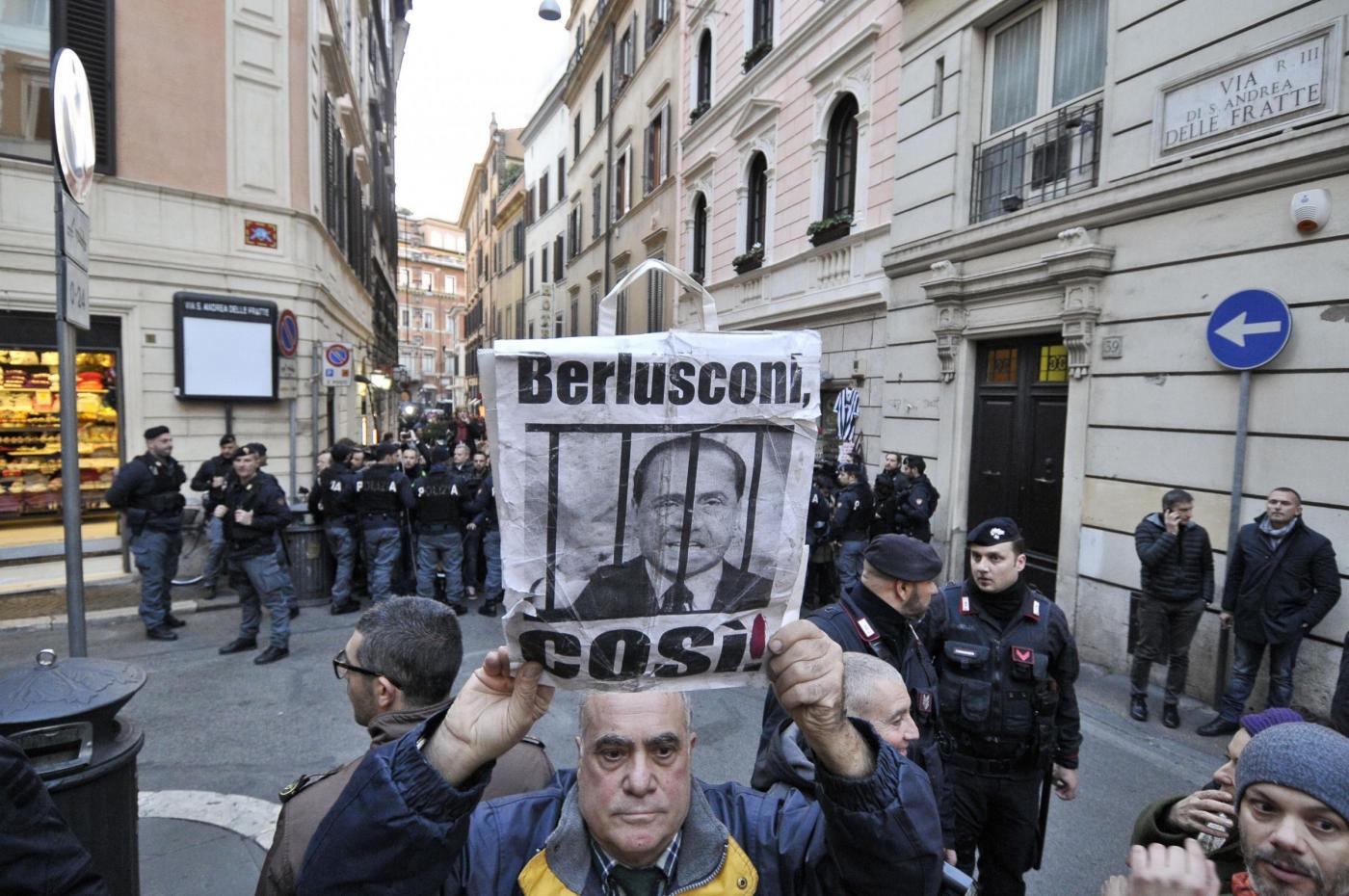 Al passaggio della macchina dell’ex premier sono state lanciate anche delle uova e alcune di queste sono finite sulla parte posteriore della macchina in cui era Berlusconi.