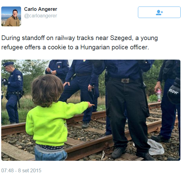 BUDAPEST – Qualche giorno fa aveva commosso il video della bimba tedesca che, a Monaco, offriva un dolcetto ad una bimba rifugiata appena arrivata. Adesso un’immagine ancora più disarmante è stata pubblicata su Twitter da Carlo Angerer, multimedia reporter della NBC News: quella di una bambina siriana che offre un biscotto agli agenti ungheresi lungo i binari del treno a Szeged, vicino al confine tra Serbia e Romania.