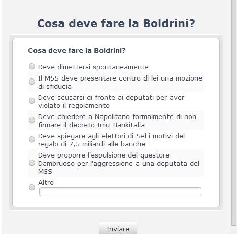 ROMA – “La Boldrini nel suo ruolo รจ inadeguata, impropria, miracolata. Lo sa lei, lo sanno tutti”. Per questo motivo, secondo il blog di Beppe Grillo, la presidente della Camera Laura Boldrini deve dimettersi. Dopo il caos alla Camera nei giorni della votazione del decreto legge Imu-Bankitalia, con le proteste e le occupazioni dei parlamentari del Movimento 5 stelle, ecco che dal blog si invitano gli attivisti a decidere se la Boldrini debba o meno abbandonare la sua carica.