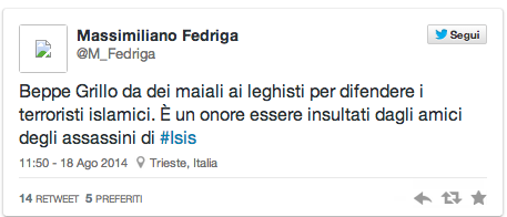 “Beppe Grillo da (dà, ndr) dei maiali ai leghisti per difendere i terroristi islamici. È un onore essere insultati dagli amici degli assassini di #Isis”.